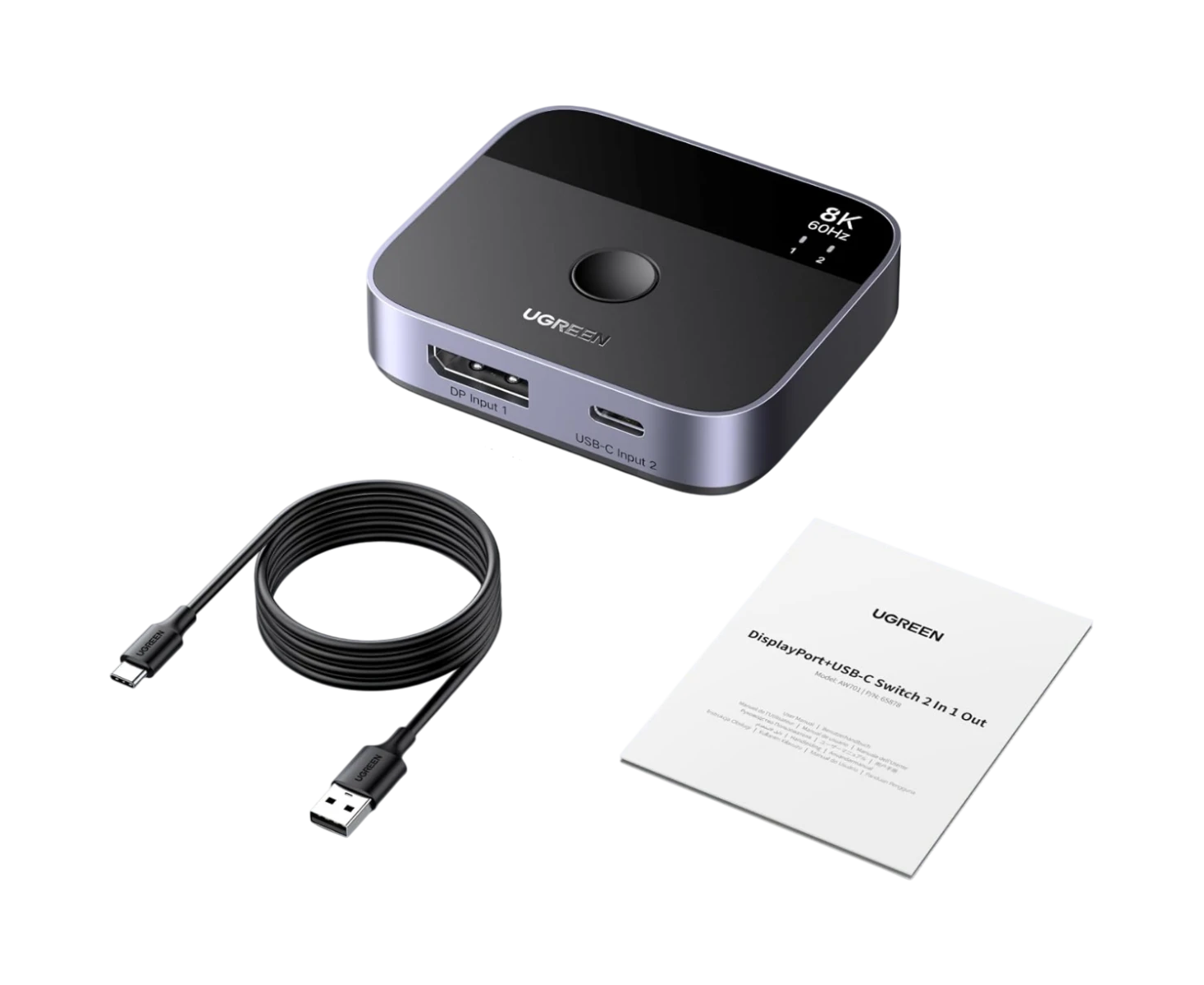 Переключатель UGREEN AW701 (65878) 2 in 1 8K@60Hz DisplayPort&USB-C Switcher. Цвет: черный