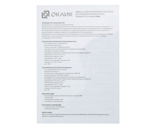 Комплект поставки: Беспроводная компьютерная клавиатура и мышь 220М.