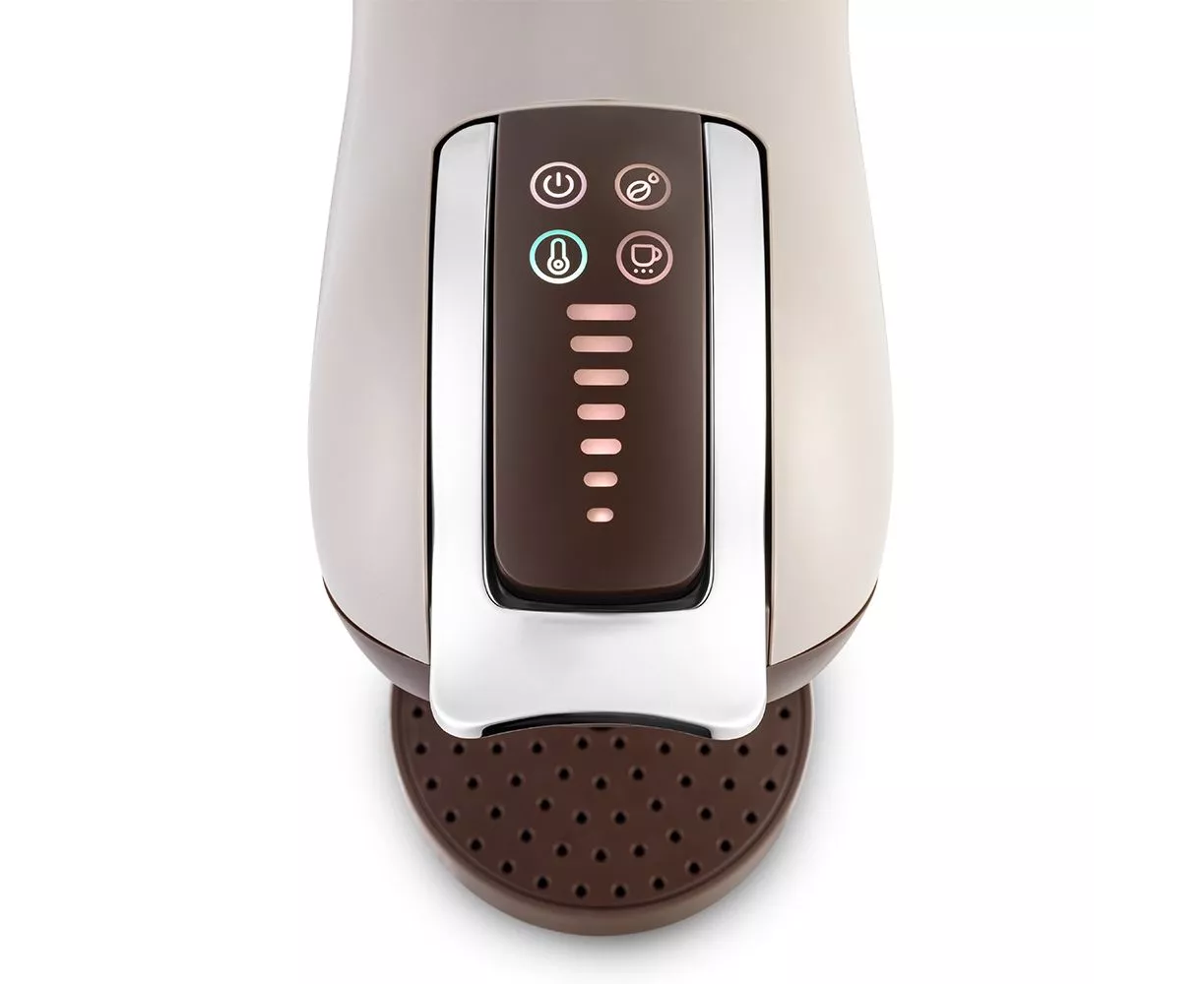 Температуру напитка и объём порции можно настроить. Кофе получается вкусным, ароматным и с пенкой. Для того чтобы настроить объём напитка, проведите пальцем по индикаторам объёма. Нажатие на кнопку «Температура» позволяет настроить t напитка.
