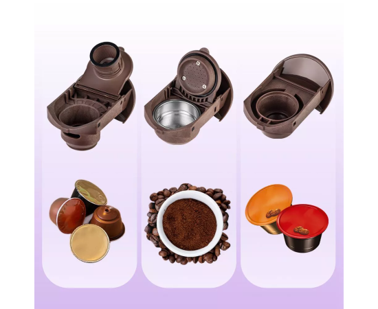 Благодаря адаптерам кофеварка подходит для капсул типа Nespresso Original и Dolce Gusto, а также для молотого кофе. Кофе в капсулах уже спрессован, для его приготовления необходимо просто поместить капсулу в адаптер, а адаптер — в кофеварку.