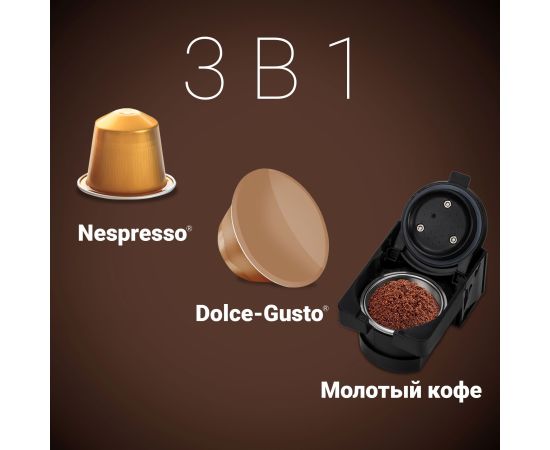 Особенности: 3 В 1: УНИВЕРСАЛЬНАЯ КОФЕВАРКА - РАБОТАЕТ С БОЛЬШИНСТВОМ КАПСУЛ, А ТАКЖЕ С МОЛОТЫМ КОФЕ. Возможность готовить одинарный и двойной объем кофе. Съемные насадки для капсул. Съемный фильтр для молотого кофе.