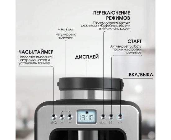 Конструкция кофеварок/кофемашин: Противокапельная система, Индикатор уровня воды, Дисплей, Фильтр от накипи