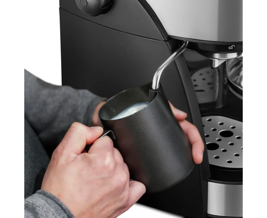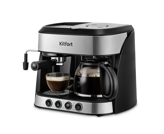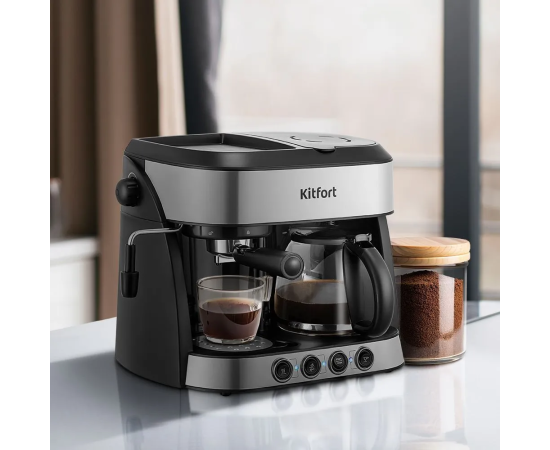 Кофейная станция Kitfort KT-7185 совмещает в себе два вида кофеварок: рожковая и капельная.