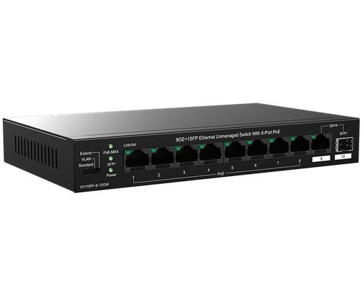 Коммутатор IP-COM G1110PF-8-120W неуправляемый PoE, 10 портов, 9x1 Гбит/с, SFP 1х1 Гбит/с, PoE 8х30 Вт (до 102 Вт)