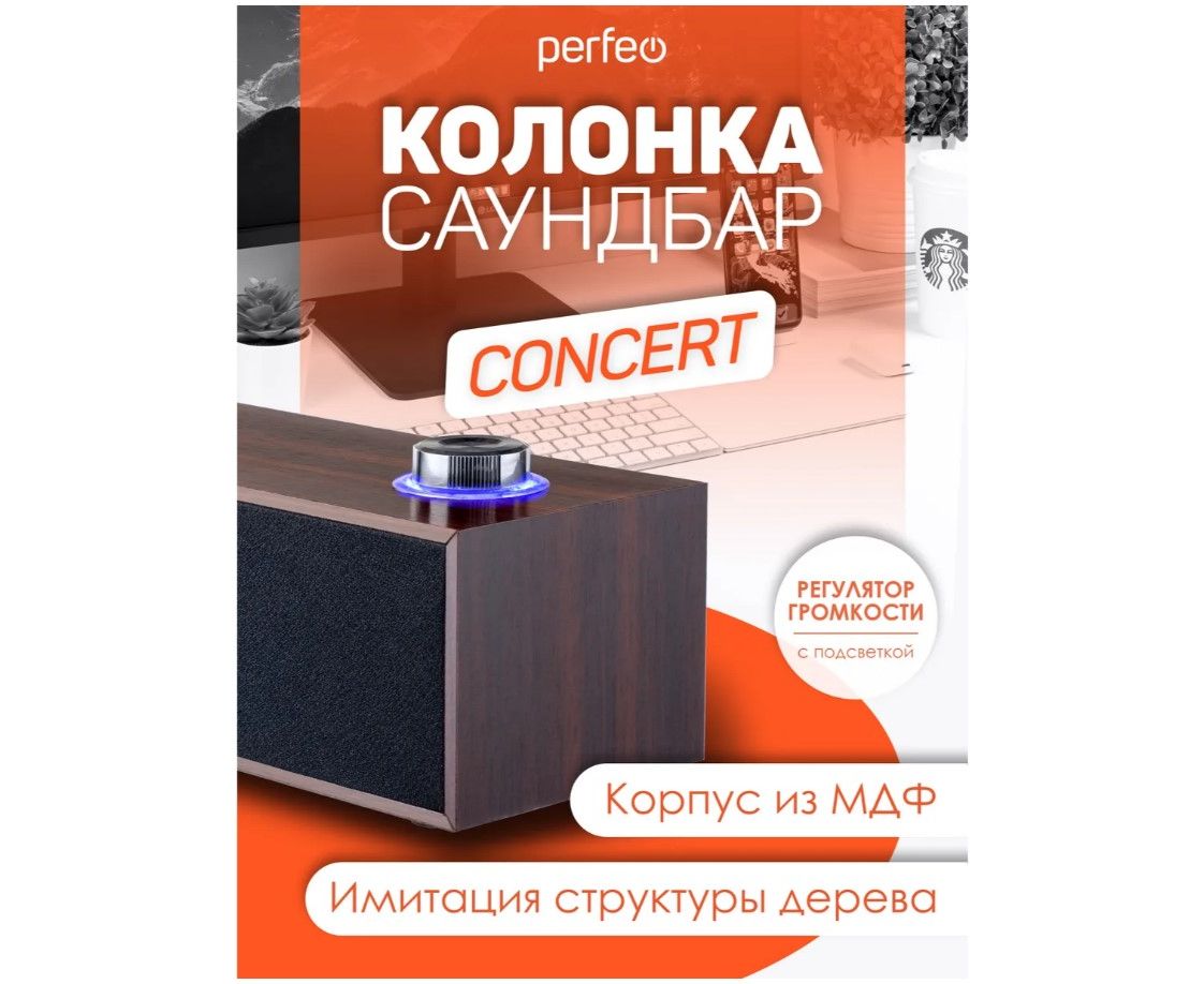 Колонка-саундбар "CONCERT" - идеально подойдёт для тех, кто работает за компьютером или ноутбуком, увлекается компьютерными играми, любит отвлечься на любимую музыку, аудиокниги, подкасты или хорошие фильмы. Подключение саундбара " CONCERT " к источникам звука осуществляется с помощью аудиокабеля с штекером Jack 3,5 мм. Питание саундбар получает через USB кабель, посредством подключения к электросети через сетевой адаптер (в комплект не входит), либо саундбар можно подключить к Power Bank'у. Саундбар "CONCERT" подарит вам яркий и насыщенный звук благодаря выходной мощности 6 Вт, а с помощью регулятора с подсветкой на верхней панели корпуса колонки очень удобно регулировать громкость звука! Корпус сделан из высококачественного МДФ с имитацией структуры дерева. Колонка "CONCERT" имеет стандартный 3.5-мм штекер с помощью которого возможно подключение практически к любому совместимому аудиоустройству. Длина USB и аудио кабеля (1,3 м) позволяет размещать саундбар там, где вам комфортно и необходимо.