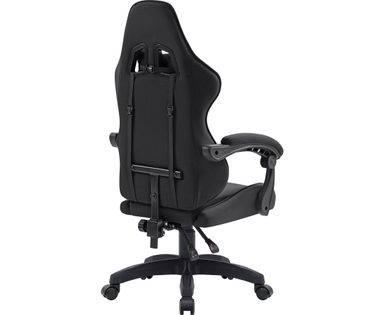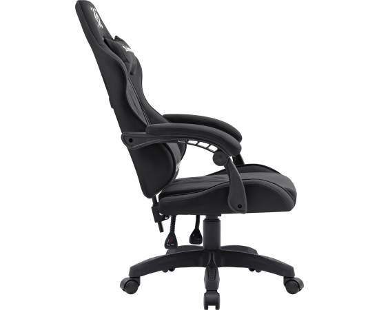 Стильное игровое кресло с мягкими подлокотниками и регулируемым наклоном спинки. В комплект входят шейная и поясничная подушки. Обивка выполнена из прочной мягкой ткани черного цвета.
