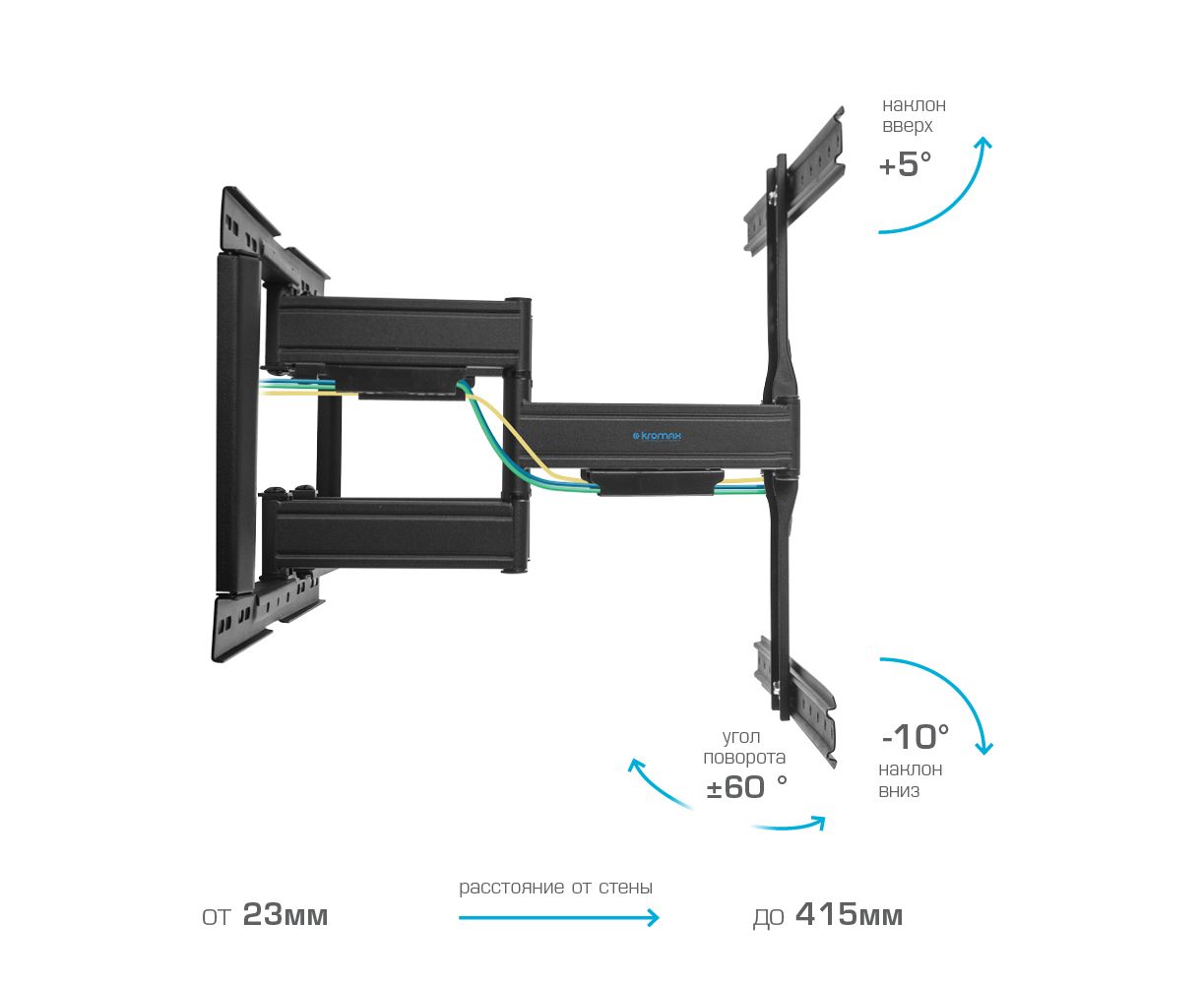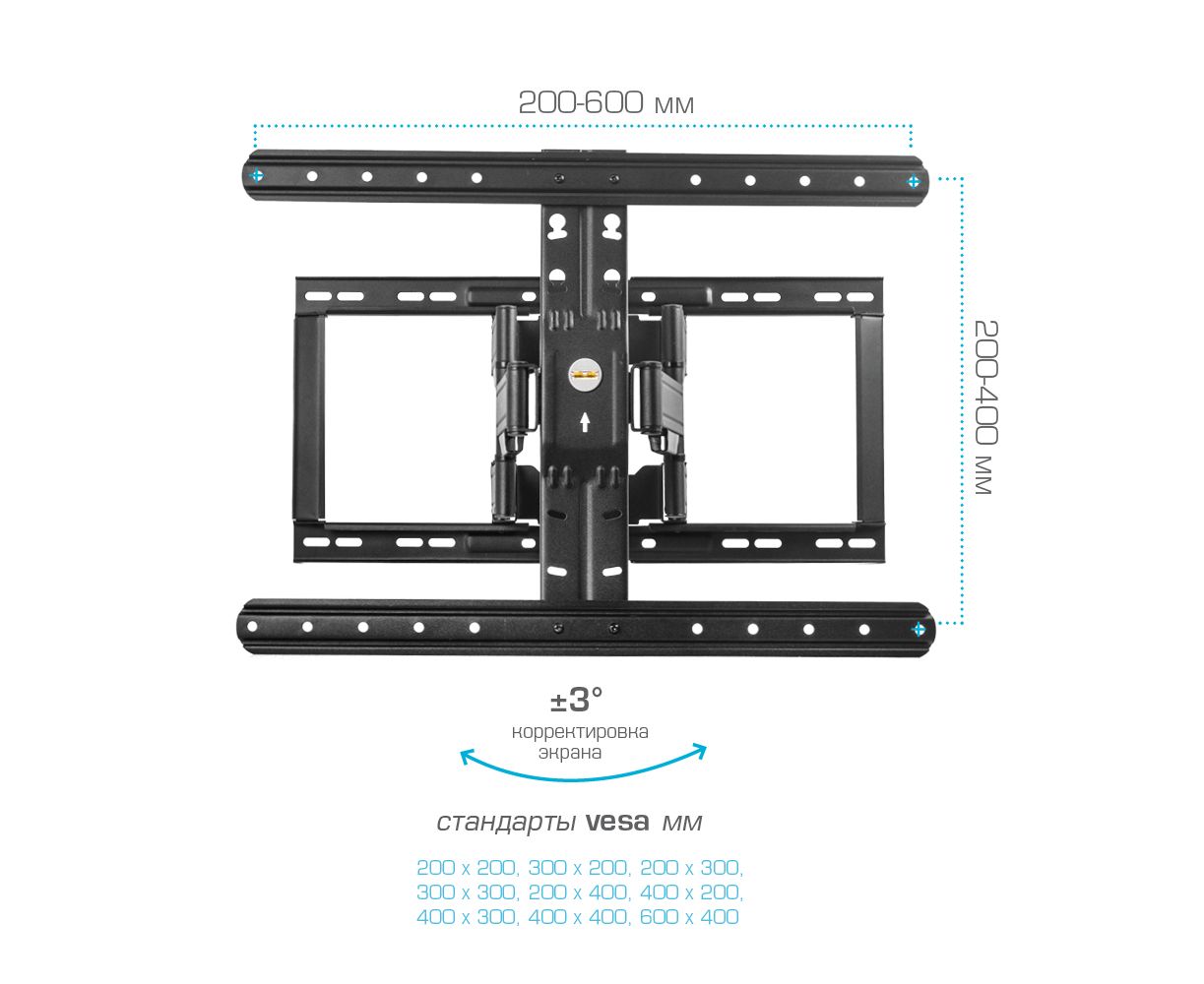 Усиленное настенное основание широкая монтажная пластина обеспечивает надежное крепление ТВ на стену, Надежная стальная конструкция максимальная нагрузка до 60 кг, Универсальная система крепления, Корректировка экрана уникальная возможность вращения экрана на ±3° относительно стены