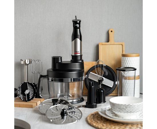 9 основных функций: приготовление пюре, нарезка кубиками, приготовление напитков, замешивание теста, взбивание, нарезка, шинковка, тёрка, измельчение
