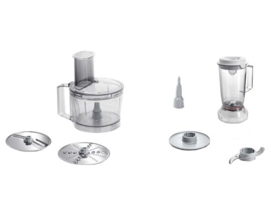 - универсальный нож, насадка для теста, насадка для взбивания, терка, насадка для нарезки ломтиками, общее число насадок: 4