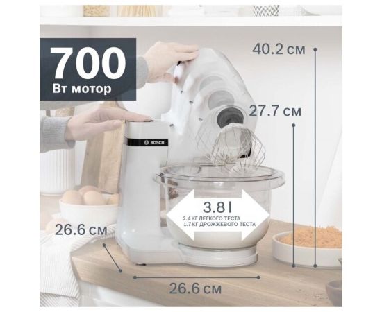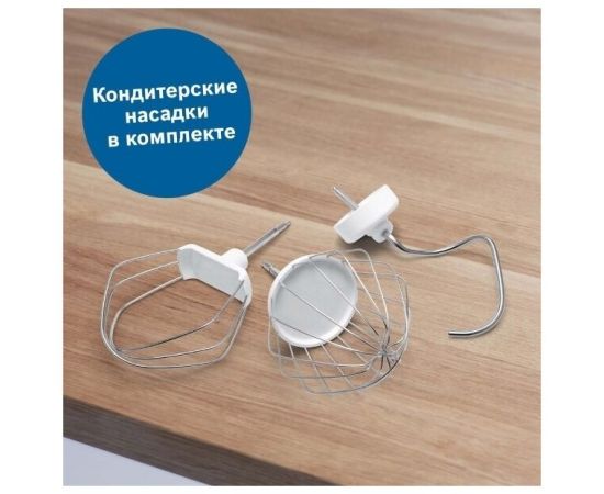 Bosch MUMS2TW01 – кухонная машина, которая облегчит и ускорит множество кулинарных задач. Модель поставляется с двумя венчиками для взбивания кремов и бисквита, крюком для замешивания теста и тремя разными тёрками для шинковки овощей и измельчения сыра и орехов.