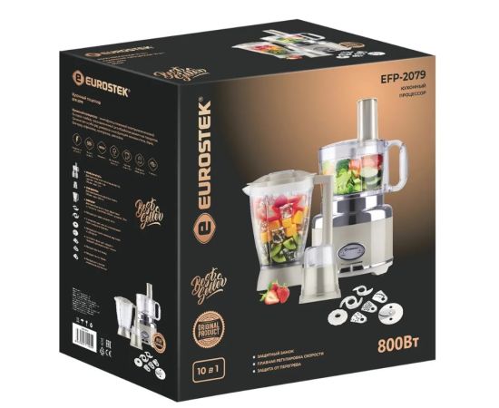 Кухонный комбайн "Eurostek" EFP-2079. Максимальная мощность 800Вт; металлический корпус, плавная регулировка скорости; измельчитель 1.2л., блендер 1.75л., кофемолка. Стальные лезвия измельчителя; диски для размягчения, получения эмульсий. Нарезка тонкими ломтиками, шинковка, приготовление жульена, картофельная терка - с 4-мя вставками.