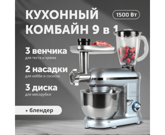 Комбайн кухонный, насадки (крюк для теста, плоский битер, венчик для взбивания), чаша металлическая, чаша блендера, мясорубка с 3 решетками и 1 ножом, металлический лоток для мясорубки, инструкция по использованию кухонного комбайна с мясорубкой, плотная упаковка для комбайна.