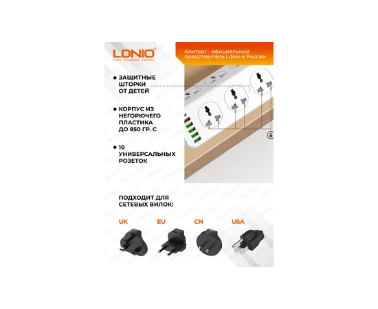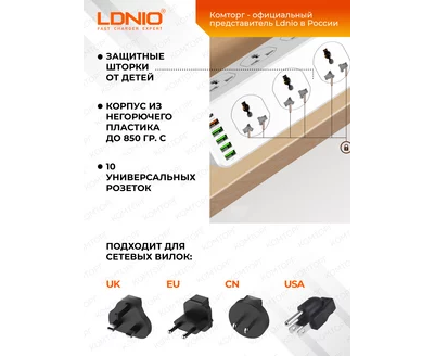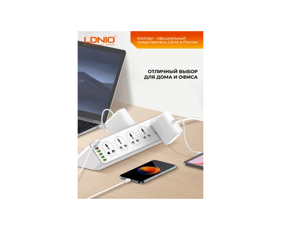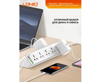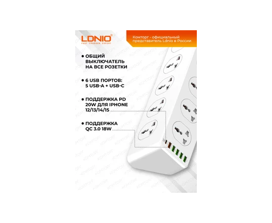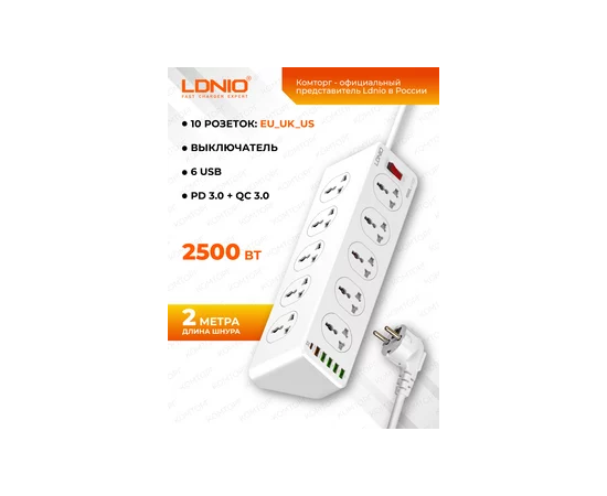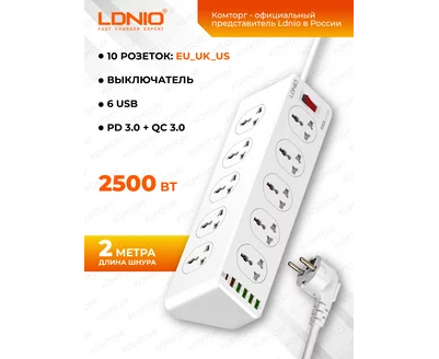 Сетевой удлинитель LDNIO SC10610/ 2м / 10 розеток EU_UK_US/ 2500W/ 6 USB: QC 3.0+PD 3.0 30W/ Белый, (Арт. LD_D0426)