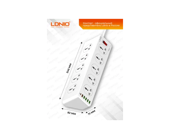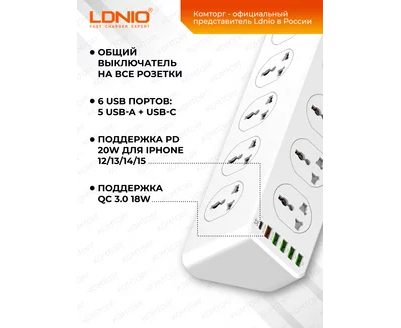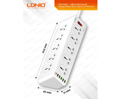 Длина кабеля 2 метра. Сетевой фильтр LDNIO Universal предназначены для подключения электроприборов в местах, удалённых от стационарных розеток, также помимо этого в блоке расположен центральный выключатель для более безопасного использования, а также целых 6 портов USB для зарядке различных устройств с выходной мощностью 30W 5V/3.4 . Розеточный блок изготовлен из ударопрочной пластмассы.