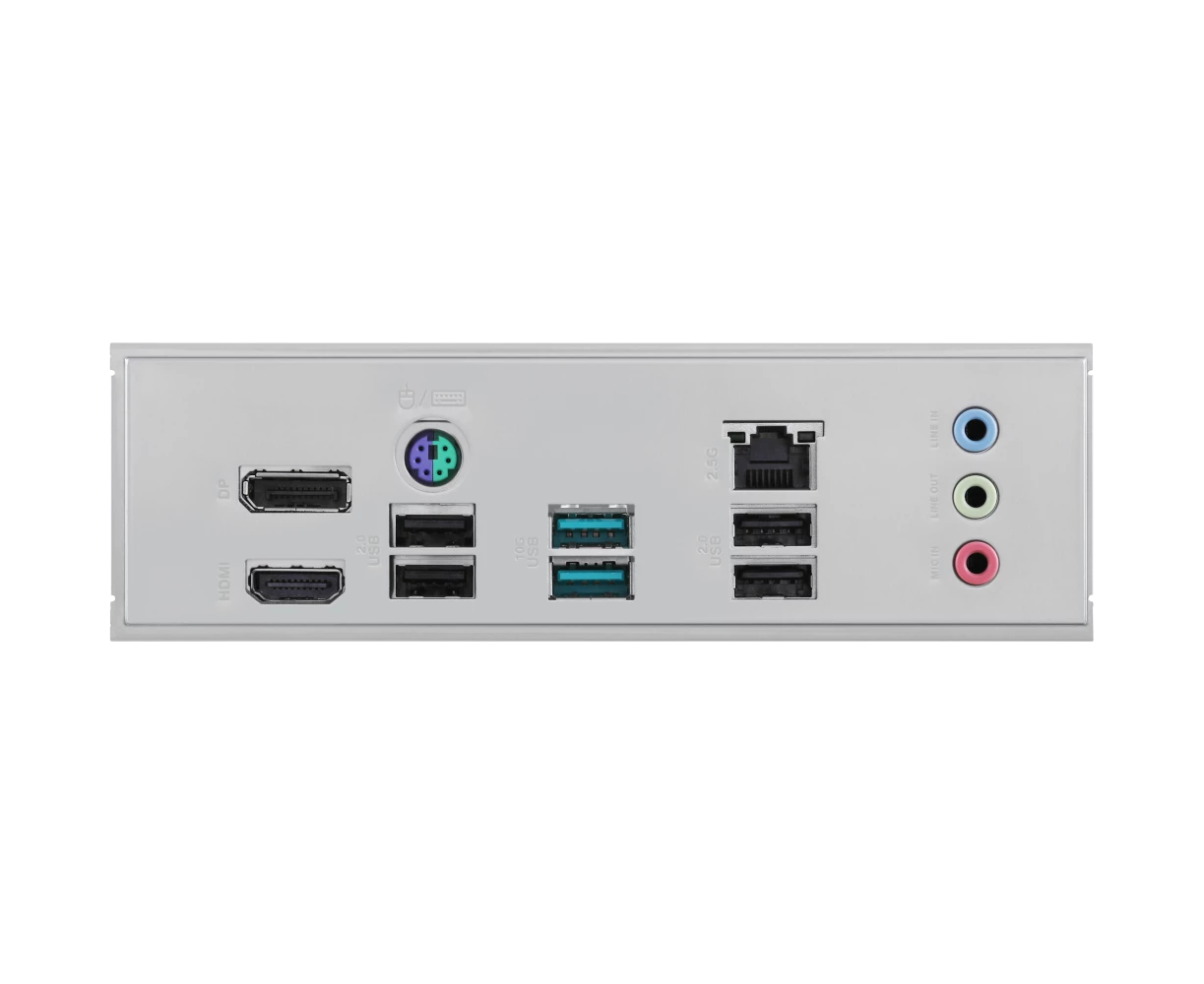 PS/2, 4 x USB 2.0, 2 x USB 3.2 Gen2, HDMI, DisplayPort, RJ-45
