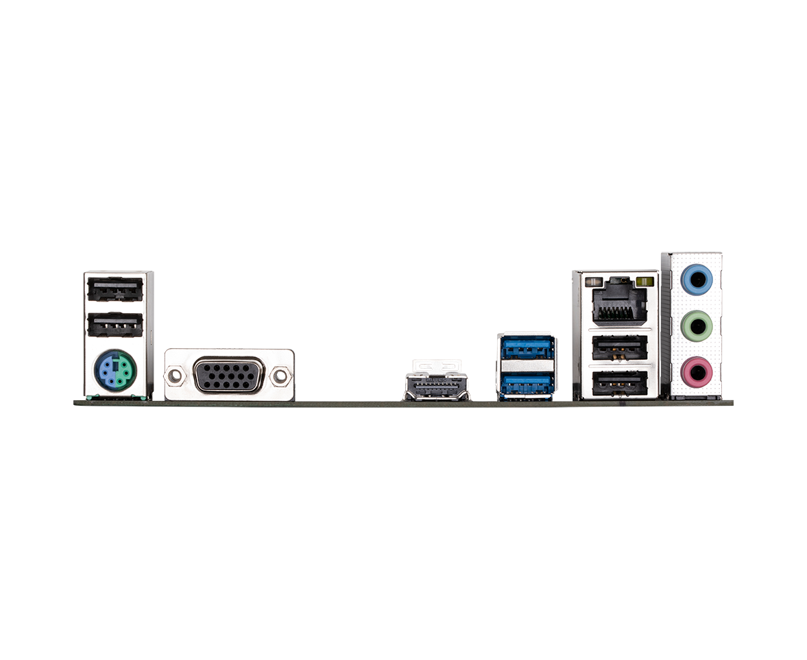 PS/2, 4 x USB 2.0, 2 x USB 3.2 Gen1, VGA, HDMI, RJ-45