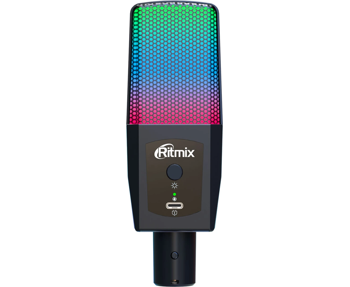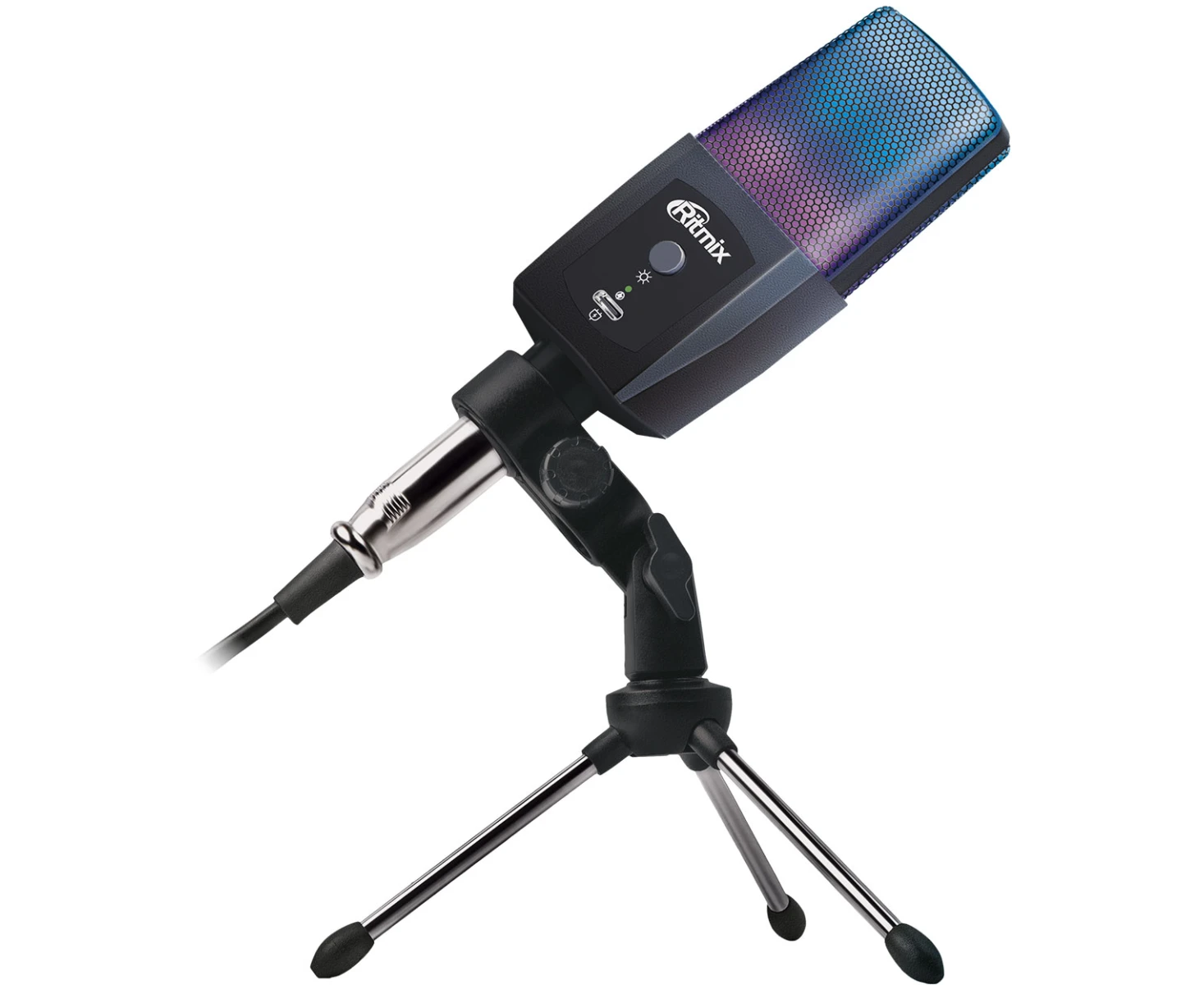 разъём USB Type-C для зарядки подсветки, в комплекте: кабель XLR - jack 3.5 мм, трипод; для подключения к смартфонам, планшетам и ноутбукам с совмещённым разъёмом для наушников и микрофона может потребоваться переходник: TRRS штекер 3.5 мм -> 2xTRS гнезда 3.5 мм