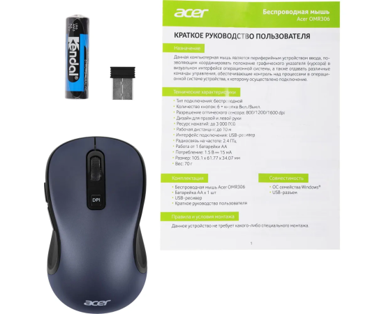 Мышь беспроводная Acer OMR306 (ZL.MCECC.021) черный/серый (1600dpi) USB (6but)