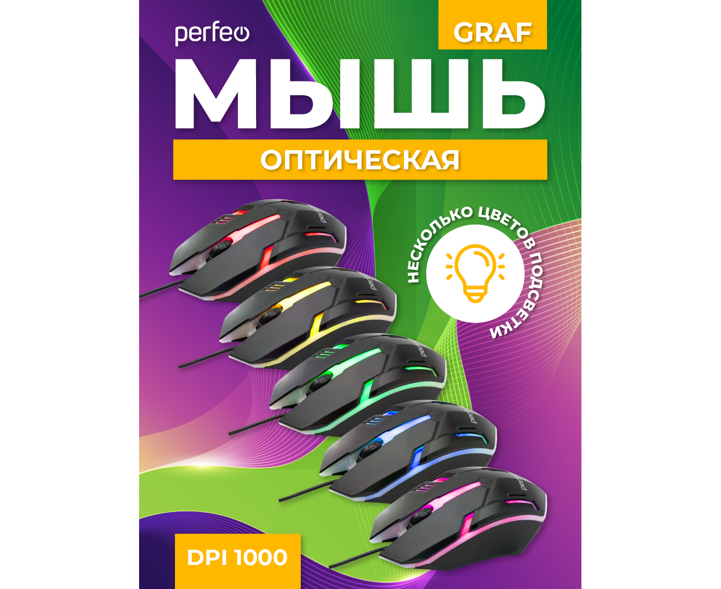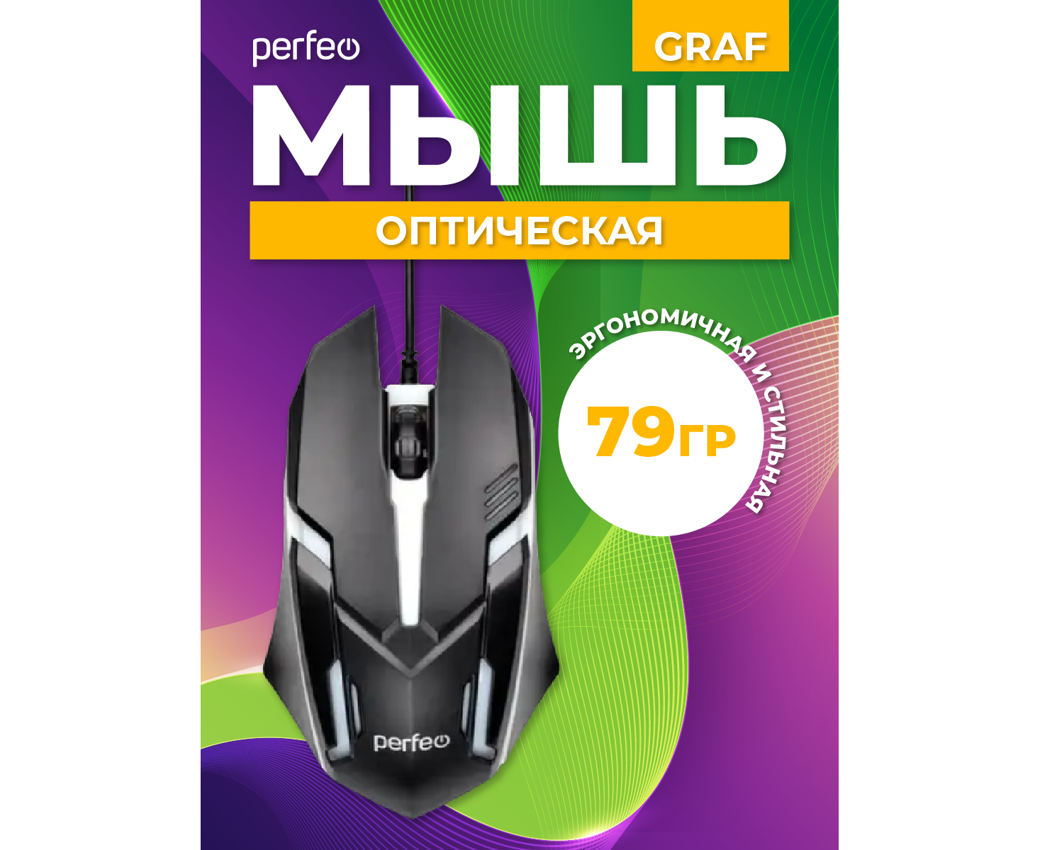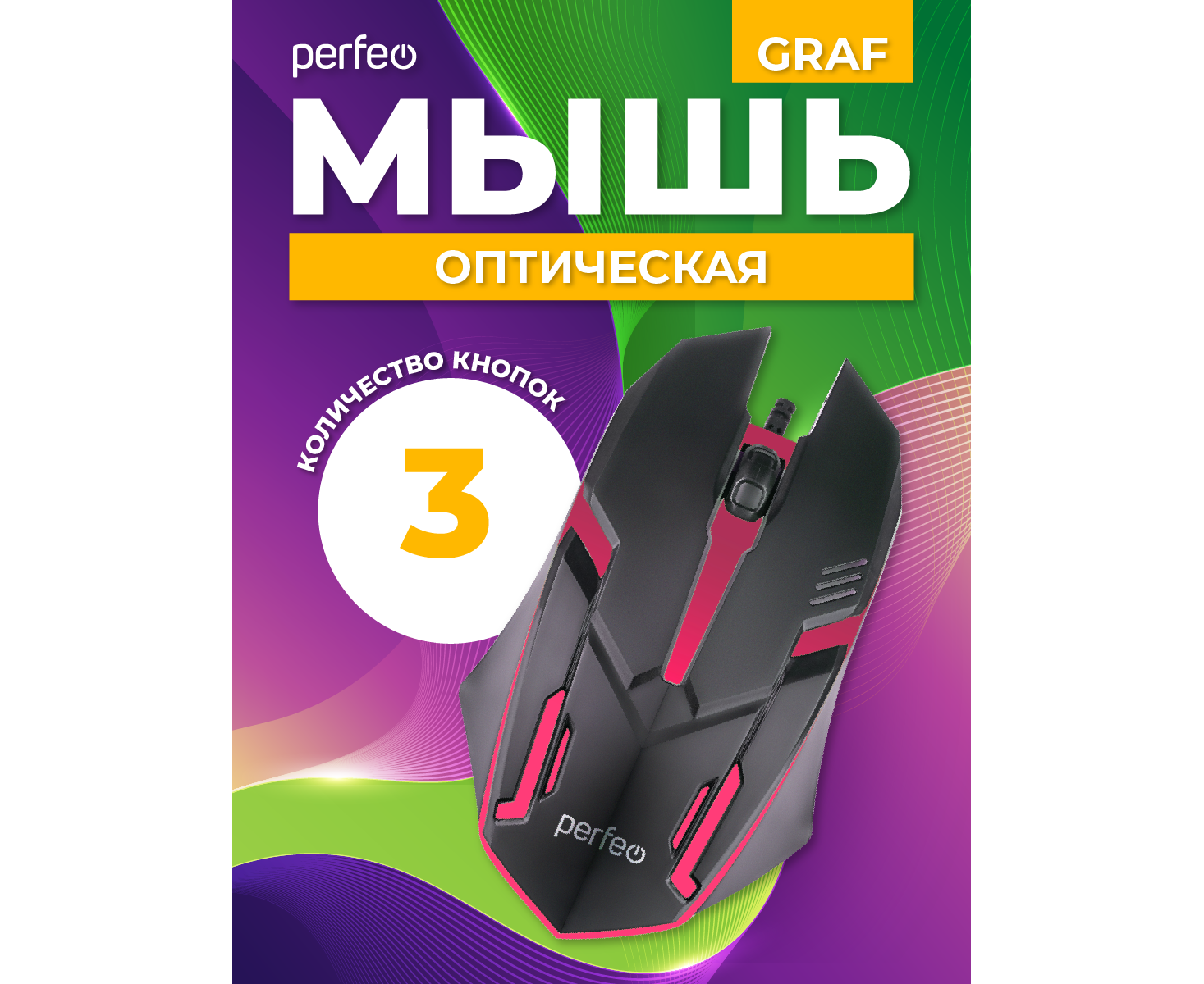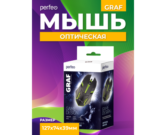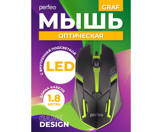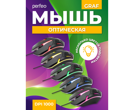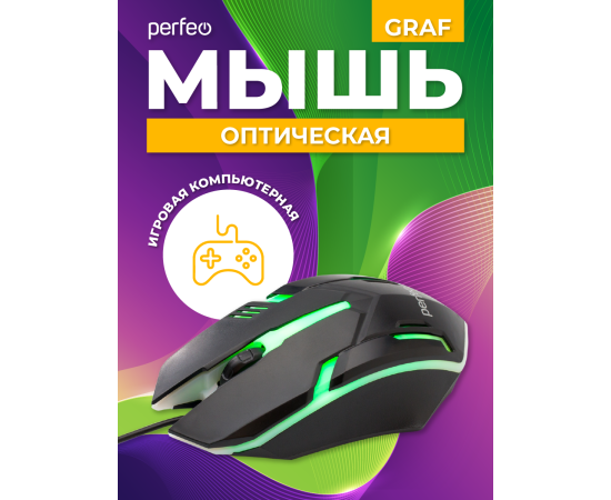 Оптическая мышь Perfeo "GRAF", 3 кн, USB, GAME DESIGN, 1000 DPI, черный, 7 цв. подсветка, (Арт. PF_A4798)