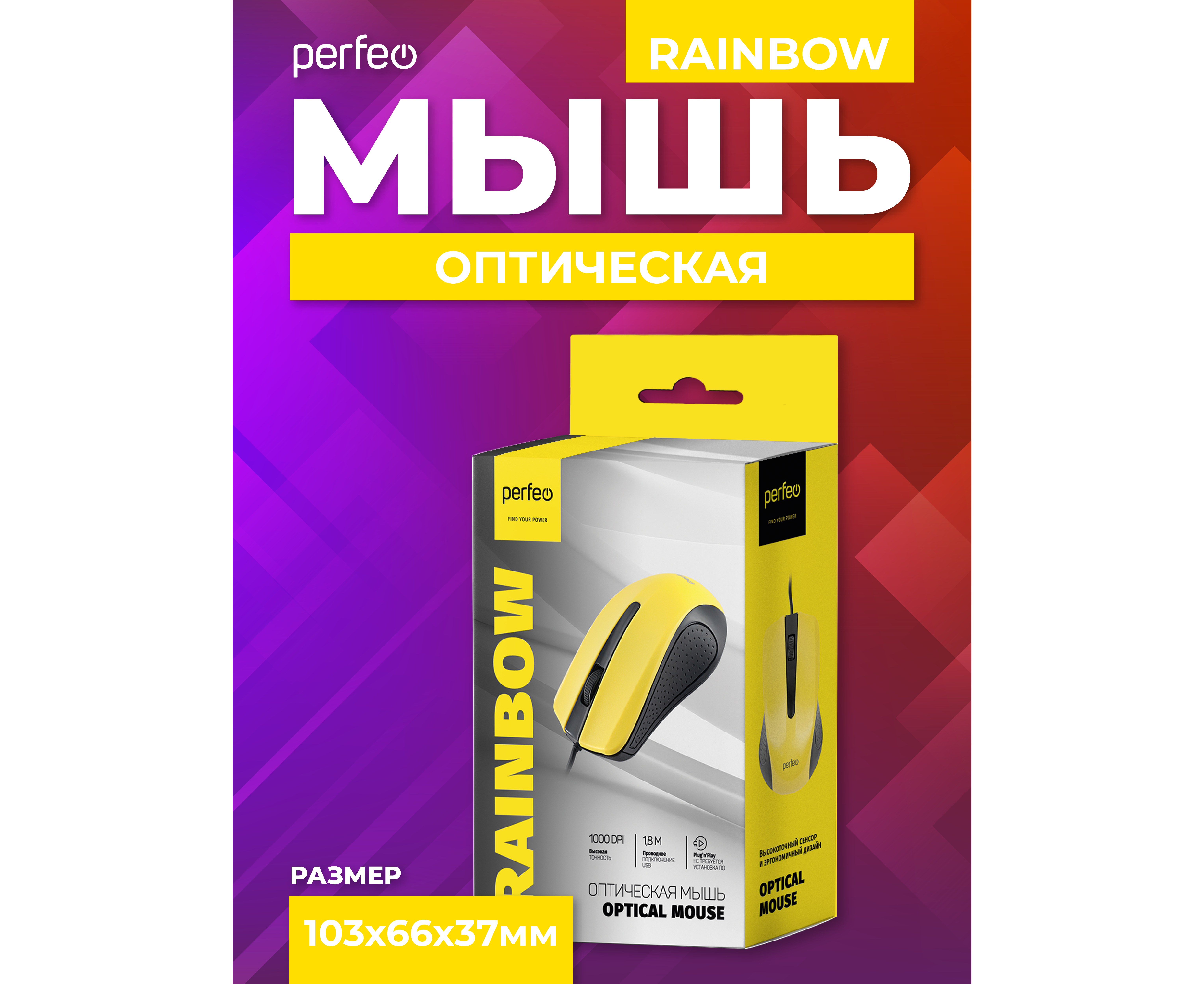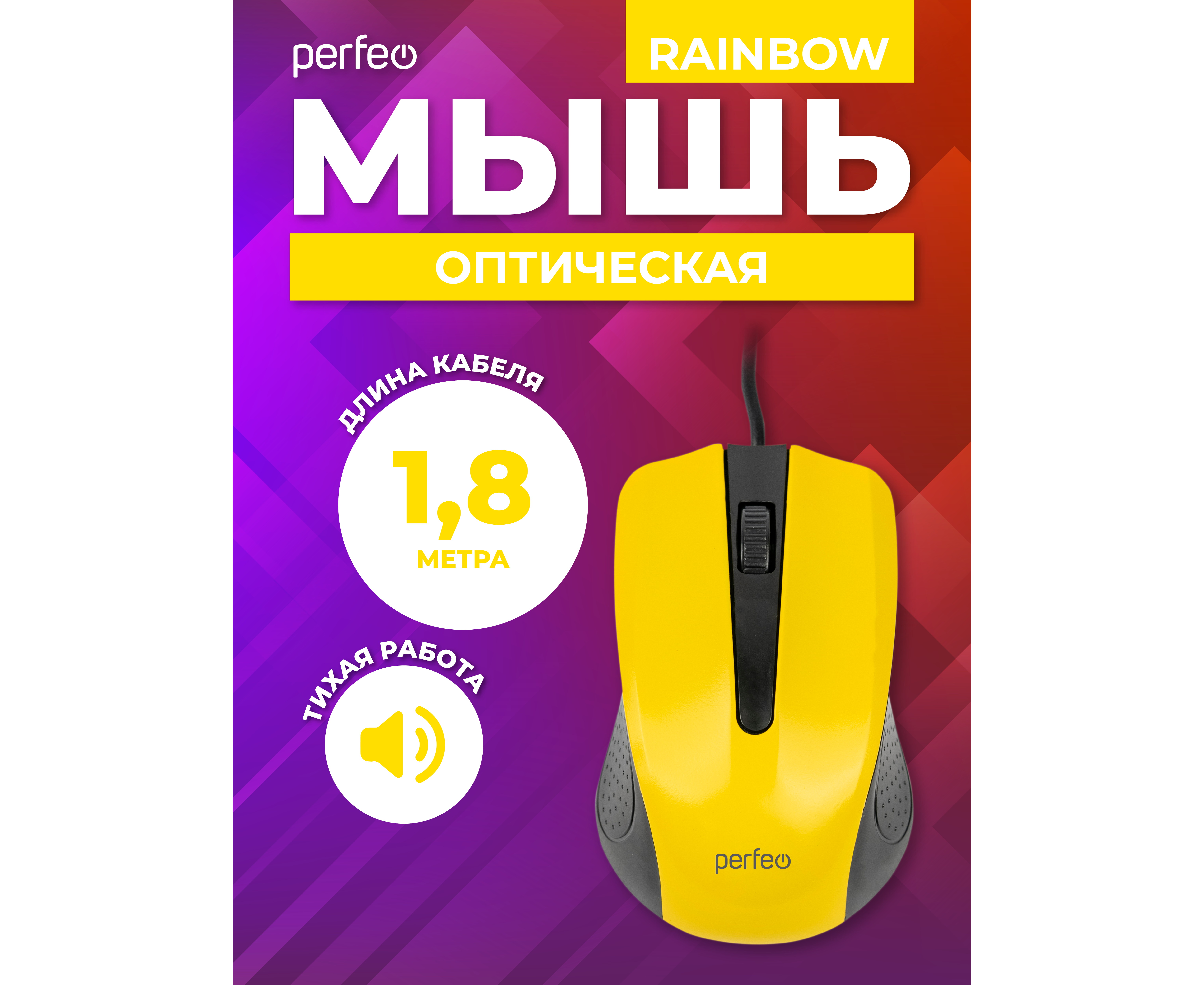 Классическая, доступная, оптическая мышь Perfeo RAINBOW. Эргономичный дизайн. Работает практически на любой поверхности. Боковые части с перфорированной поверхностью, которая обеспечивает удобный хват и предотвращает скольжение мыши в руках. Имеет 2 кнопки и ребристое колесо-кнопка (приятное тактильное ощущение при работе и не будет соскальзывать палец). Мышь для компьютера идеально подходит для использования в офисе. Мышка представлена в нескольких цветовых вариантах, что позволит подобрать решение на любой вкус и под любой интерьер. Длина кабеля 1,8м (+/- 0,1м) достаточная для комфортного подключения мыши практически в любых возможных услових стандартного рабочего места в офисе или дома.