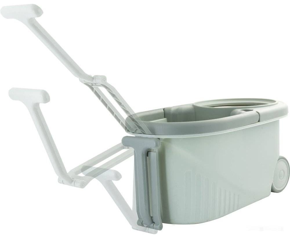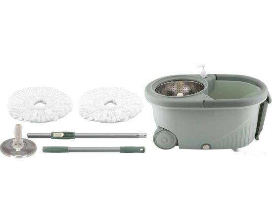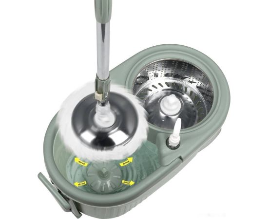 В набор для мытья полов входит ведро объёмом 7 л, вращающаяся швабра с насадкой из микрофибры, 1 запасная насадка и дозатор.