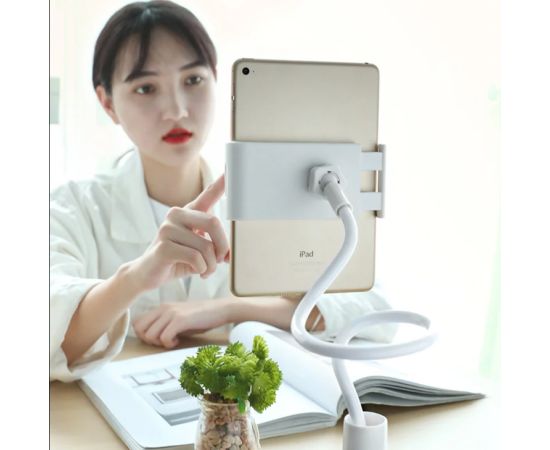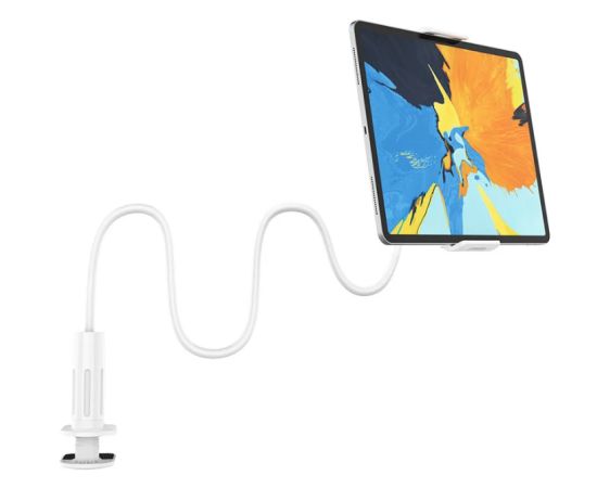 Держатель позволяет разместить планшет в портретной или альбомной ориентации, обеспечит пользование гаджетами максимально комфортным и удобным. Разъемы для наушников и зарядки доступны на обеих сторонах зажима. Оптимальный угол обзора. Ширина зажима: 122-200 мм, Поворотный механизм на 360 градусов. Регулировка кронштейна на толщину столешницы до 10 см. Размер: 70 см. Вес: 304 г.