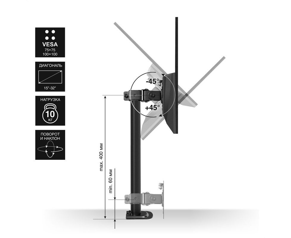 Регулируемая высота: Позволяет настроить высоту монитора в зависимости от роста пользователя и его предпочтений, что способствует более удобной работе и снижает нагрузку на шею и спину.