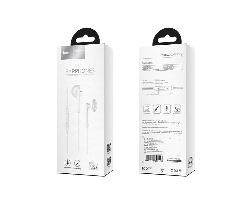 Наушники HOCO M53 Exquisite sound wired earphones with mic white
