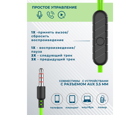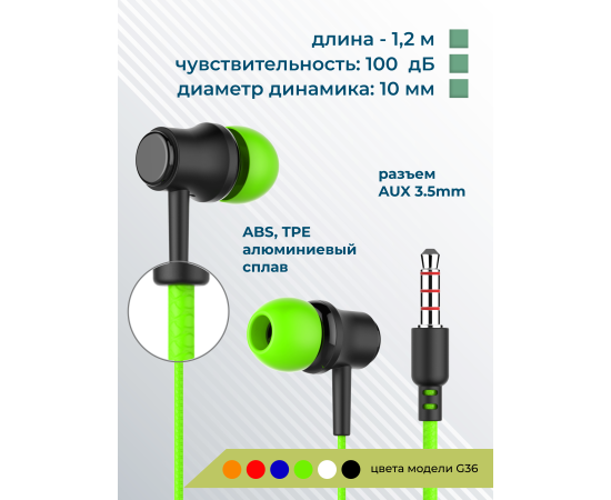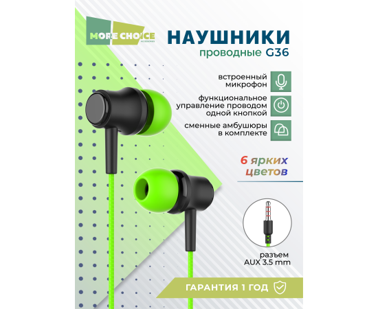 Наушники вакуумные AUX разъём с МК без рег.громкости длина 1.2м More Choice G36 (Green)