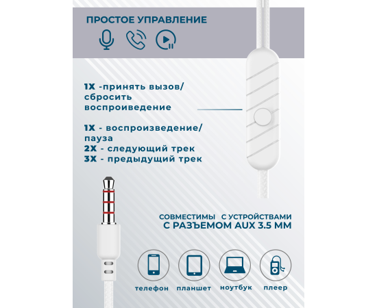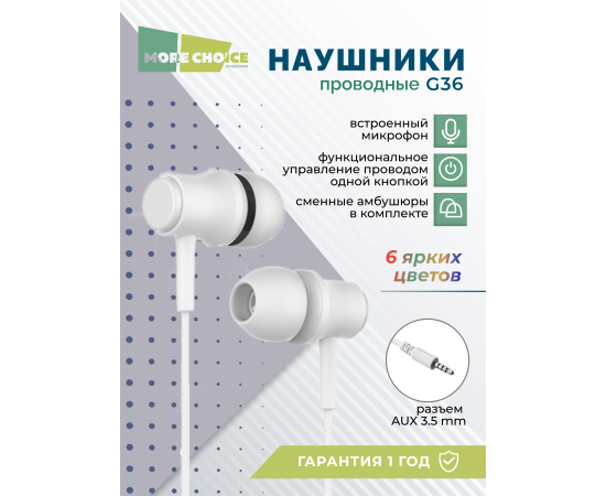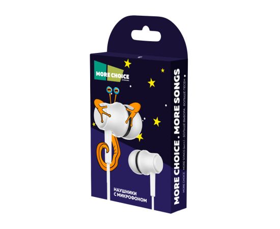Наушники вакуумные AUX разъём с МК без рег.громкости длина 1.2м More Choice G36 (White)
