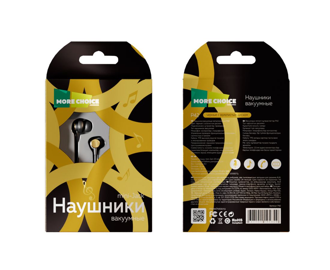Наушники вакуумные AUX разъём с МК без рег.громкости длина 1.2м More choice P42 (Black Gold)