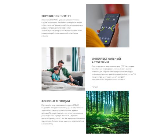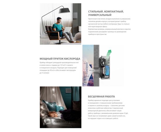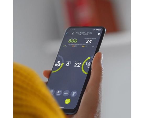 Приточный очиститель воздуха Ballu ONEAIR ASP-100 обеспечивает безопасное проветривание помещений площадью до 40 м2. Высокая производительность прибора - до 125 м3/час обеспечит кислородом до 4 человек. Для очистки воздуха в базовой комплектации установлена 2-ступенчатая система фильтрации - HD-Prefilter и фильтр HEPA класса H13, устраняющая загрязнители и аллергены. Керамический нагревательный элемент и климат контроль позволяют комфортно использовать прибор при температуре до -40С. А автоматический клапан закрывает воздуховод при отключении прибора. Стильный тканевый корпус и компактные размеры (264х352х160мм) позволяют устройству гармонично вписаться в любой интерьер. Универсальный монтаж и скрытое подключение предоставляют возможность установить прибор как вертикально, так и горизонтально. Тихую и производительную работу прибора обеспечивает инверторный DC-двигатель. Прибор имеет 7 скоростей и набор полезных режимов. Turbo-режим - полное обновление воздуха за 15 минут в помещении до 15 м2 Ночной режим делает работу прибора практически бесшумной, всего 19 дБ. Для простой и удобной эксплуатации предусмотрен режим Авто, в котором приточный очиститель самостоятельно включается и регулирует мощность подачи воздуха по показаниям датчика CO2 (приобретается отдельно), а также выключается, переходя в режим ожидания, достигнув хорошего уровня CO2. Режим Авто доступен только при установленном датчике CO2 Режим ЭКО-проветривания минимизирует расходы на электроэнергию, в этом режиме клапан открывает воздуховод, а двигатель и нагревательный элемент не активны. Управлять прибором можно сенсорными кнопками на приборе и через мобильное приложение HOMMYN по Wi-Fi. Также прибор работает с голосовыми помощниками Алисой и Марусей. Приложение HOMMYN позволяет управлять прибором как в локальной сети, так и дистанционно и расширяет возможности прибора. С его помощью вы сможете настраивать расписание и режимы работы устройства по дням и даже часам. Керамический нагревательный элемент приобретается отдельно.