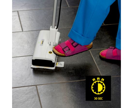 Пар против грязи: предлагаемая Kärcher паровая швабра KST 1 Upright позволяет легко очищать твердые напольные покрытия, защищенные от воздействия влаги. При тщательной очистке паром уничтожаются 99,99 % вирусов* и распространенных в быту бактерий** на твердых поверхностях. После включения аппарата можно практически сразу приступить к работе: его разогрев занимает лишь 30 секунд. Бачок для воды легко снимается для пополнения ее запаса. Долгий срок службы аппарата обеспечивается автоматическим удалением из воды солей жесткости за счет установленного в него картриджа для защиты от накипи. Замена салфеток для пола осуществляется легко и без контакта с грязью: салфетки прикрепляются к насадке для пола липучкой, благодаря чему для замены салфетки достаточно лишь наступить на ее язычок и приподнять насадку. Очень удобна и «парковка»: узкий и легкий аппарат устойчиво удерживается в вертикальном положении.