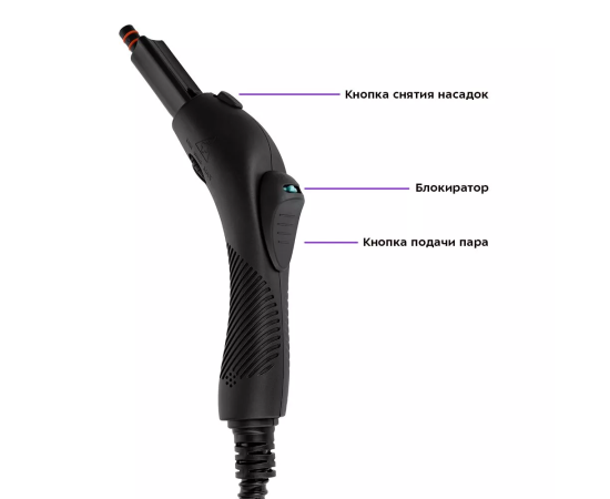 Чтобы начать подачу пара, необходимо зажать кнопку подачи пара на паровом пистолете. Блокиратор фиксирует кнопку в нажатом или не нажатом положении. Зажмите кнопку подачи пара, сдвиньте блокиратор вправо. Теперь кнопка подачи пара зафиксирована.
