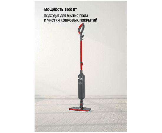Максимальная мощность составляет 1500 Вт. Кроме того, устройство обеспечивает стерилизацию поверхностей, благодаря высокой температуре пара (подача — до 23 г/мин).