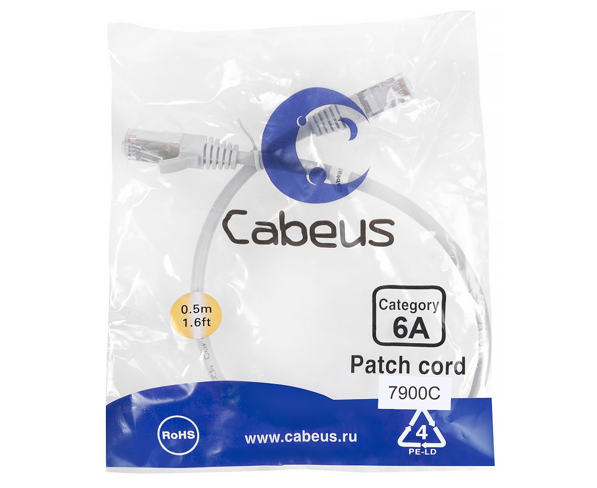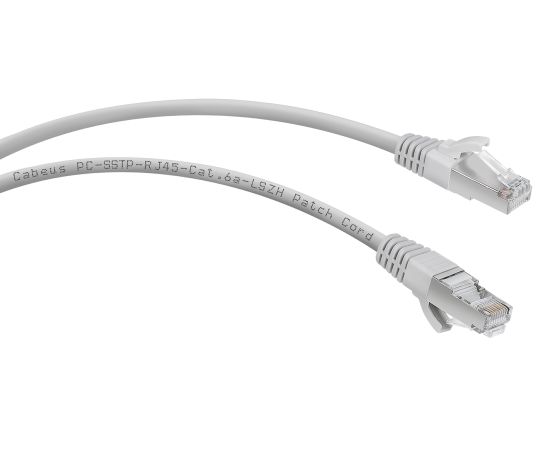 Патч-корд Cabeus (PC-SSTP-RJ45-Cat.6a-0.5m-LSZH) S/FTP, категория 6а (10G), 2xRJ45/8p8c, экранированный, серый, LSZH, 0.5м