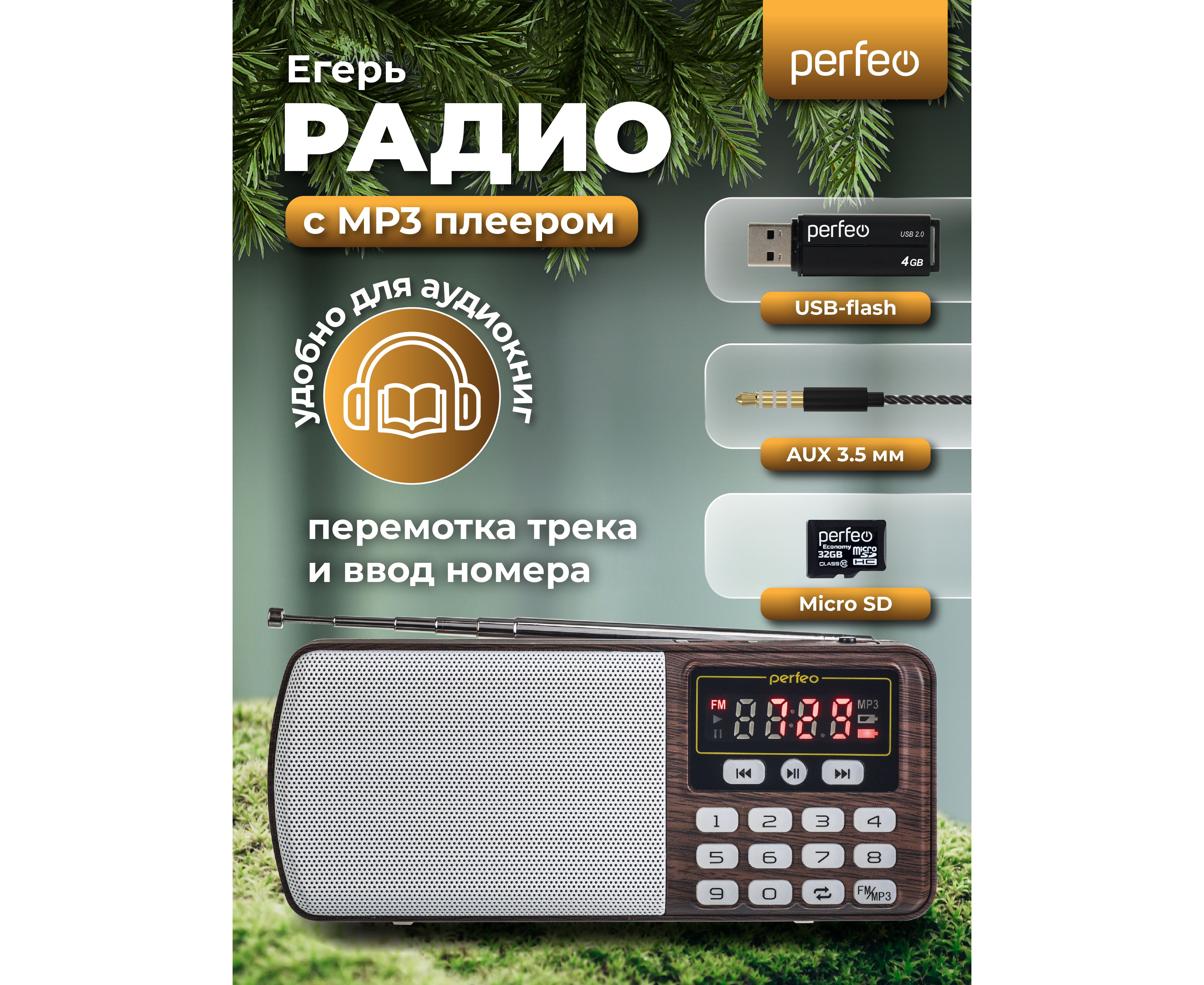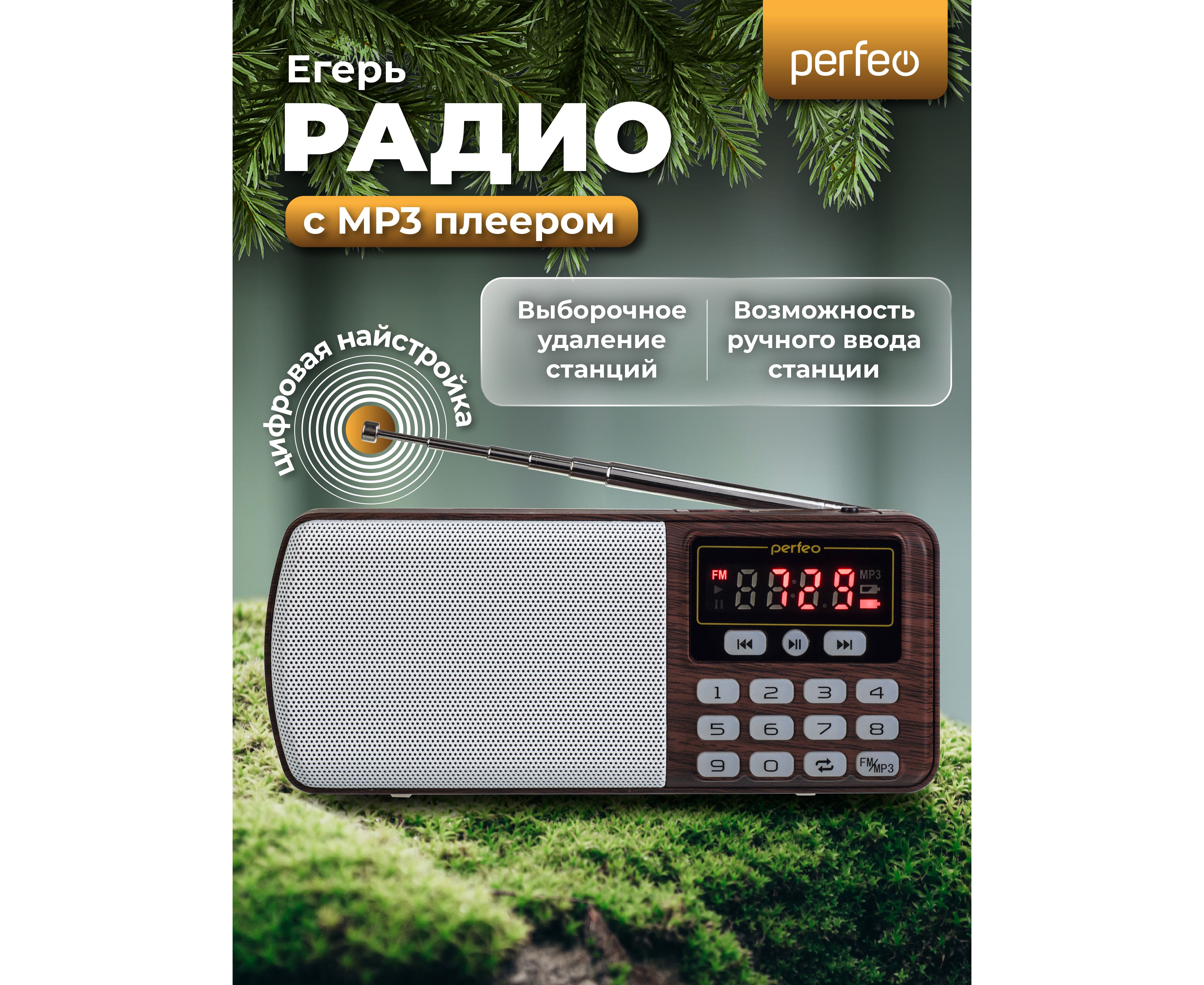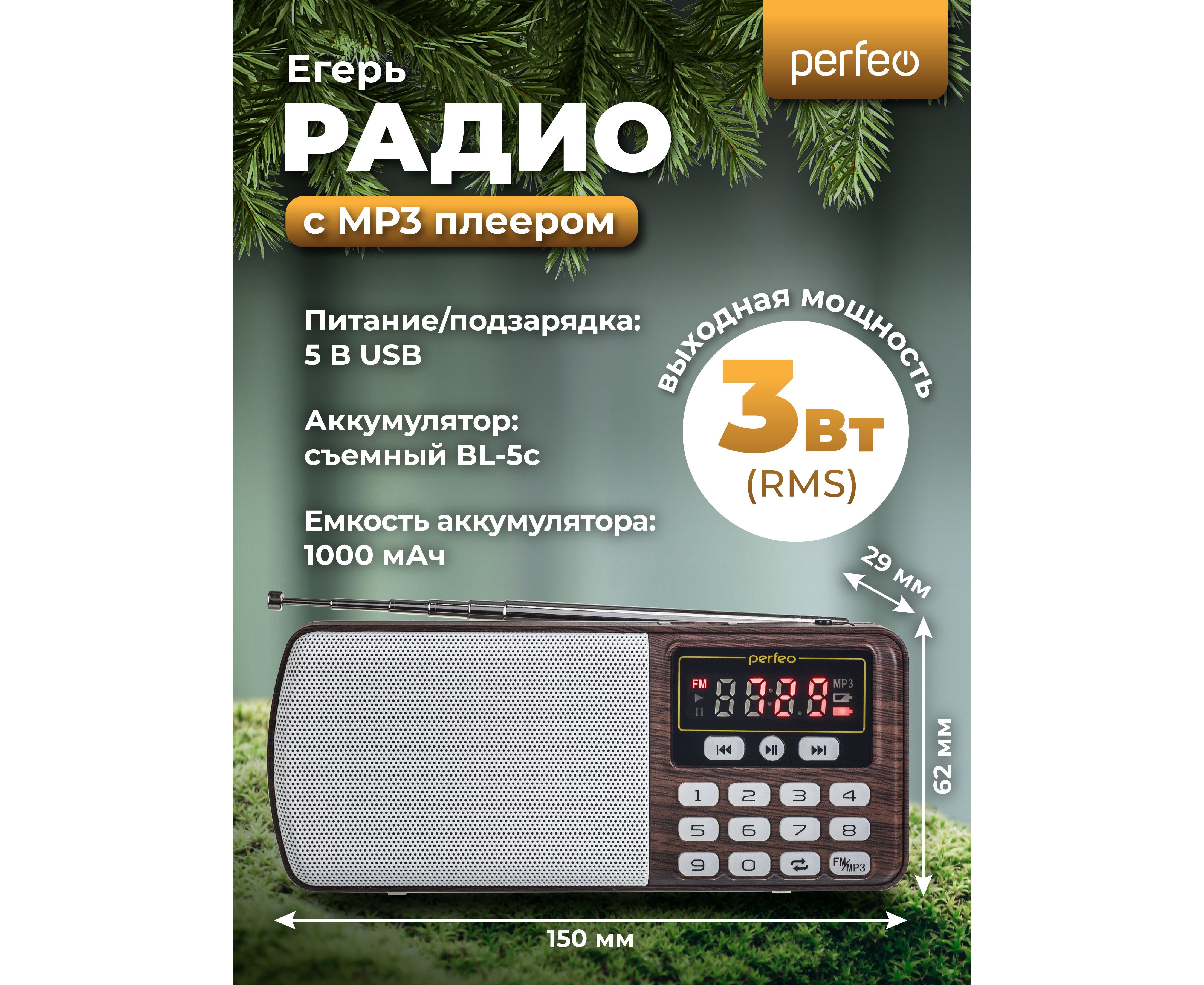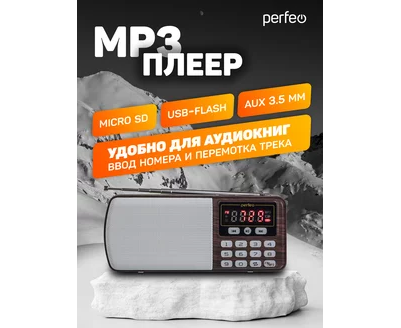 Цифровой радиоприемник Perfeo ЕГЕРЬ FM+ 70-108МГц/ MP3/ питание USB или BL5C/ Коричневый (i120-BK)