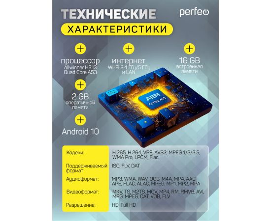 Perfeo SMART TV BOX приставка "LOGIC 2/16",Allwinner H313,Android 10, 2Gb/16Gb,Пульт Bluetooth с процессором Allwinner H313, операционной системой Android 10, объёмом оперативной памяти 2 ГБ и встроенной памяти 16 ГБ, а также пультом Bluetooth (артикул PF_A4555).