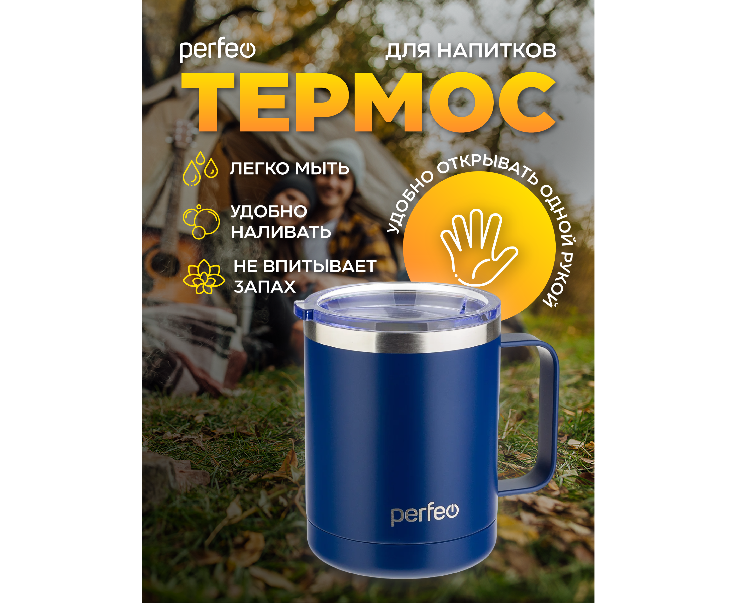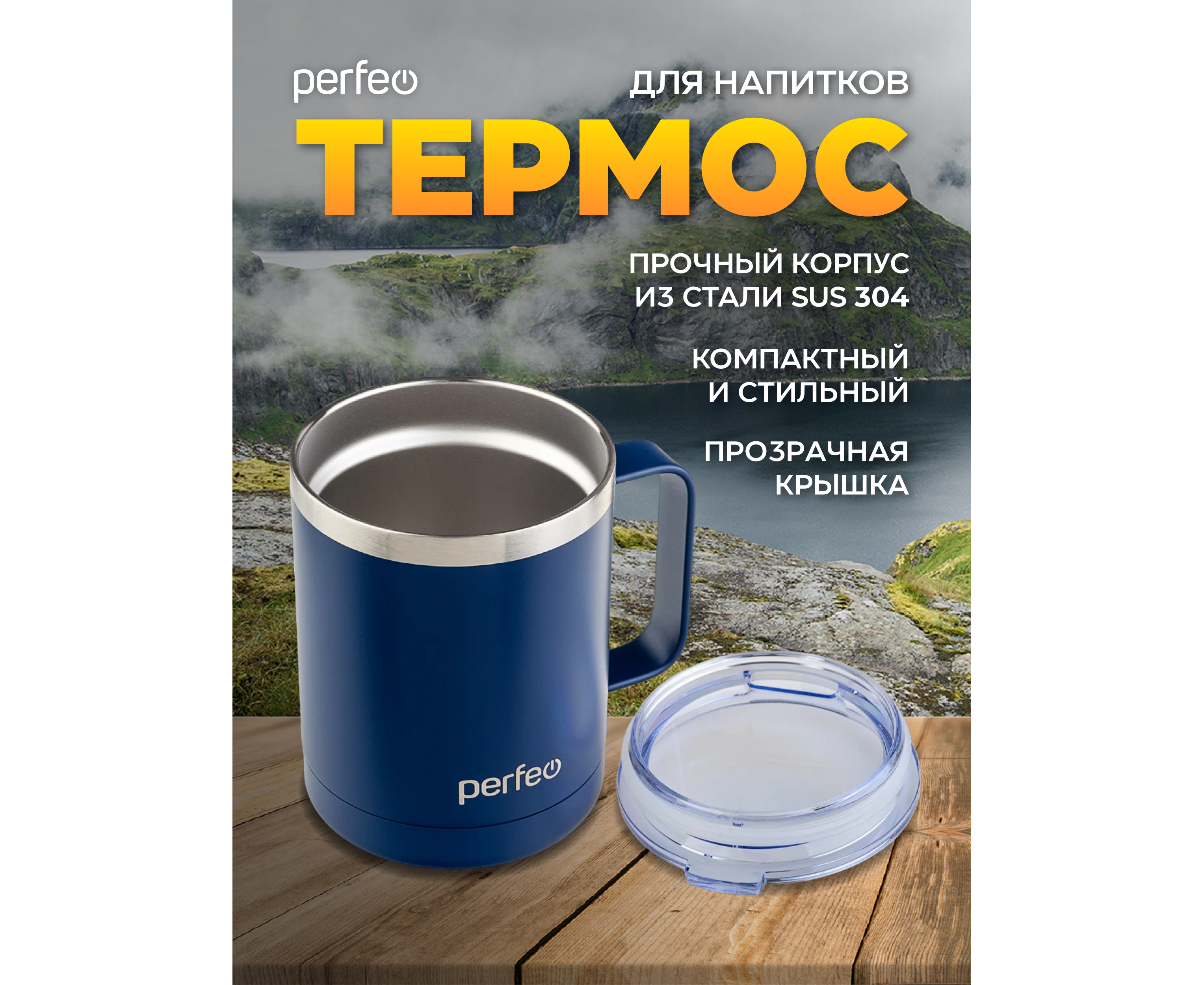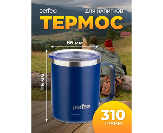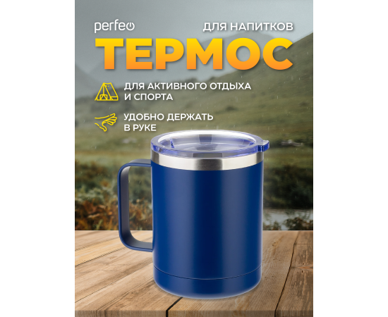 Термокружка для напитков PERFEO с прозрачной крышкой, ручкой, объем 0,35 л., темно-синий (PF_C3732)