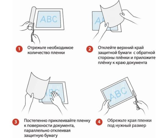 Изготовлена из высококачественного прозрачного полипропилена, толщина которого 75 мкм. Поставляется в рулоне длиной 3 м. Ширина 40 см. Срок годности не ограничен. Возможно использование ламинатора в холодном режиме. Инструкция по применению: 1. Отрезать необходимое количество пленки. 2. Отклеить верхний край защитной бумаги с обратной стороны пленки и приложить ее к краю документа. 3. Постепенно приклеивать пленку к поверхности документа, параллельно отклеивая защитную бумагу. 4. Обрезать края пленки под нужный размер. Преимуществом данного товара, несомненно, является цена в сочетании с качеством высокого уровня.