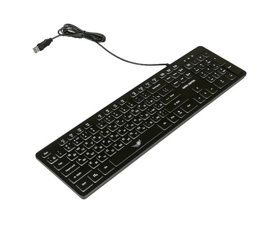 Корпус клавиатуры черный пластик. Белая латиница, белая кириллица. Клавиши с чёрной рабочей поверхностью и просвечивающими боковинами. Символы просвечиваются при включенной подсветке