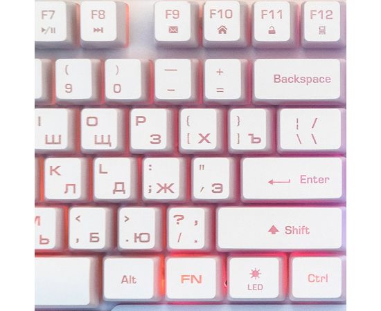 черный пластик. Белая латиница, белая кириллица. Полностью непрозрачные матовые чёрные клавиши, светящиеся матовые белые направляющие клавиш. Символы просвечиваются при включенной подсветке, плюс эффект свечения за клавишами