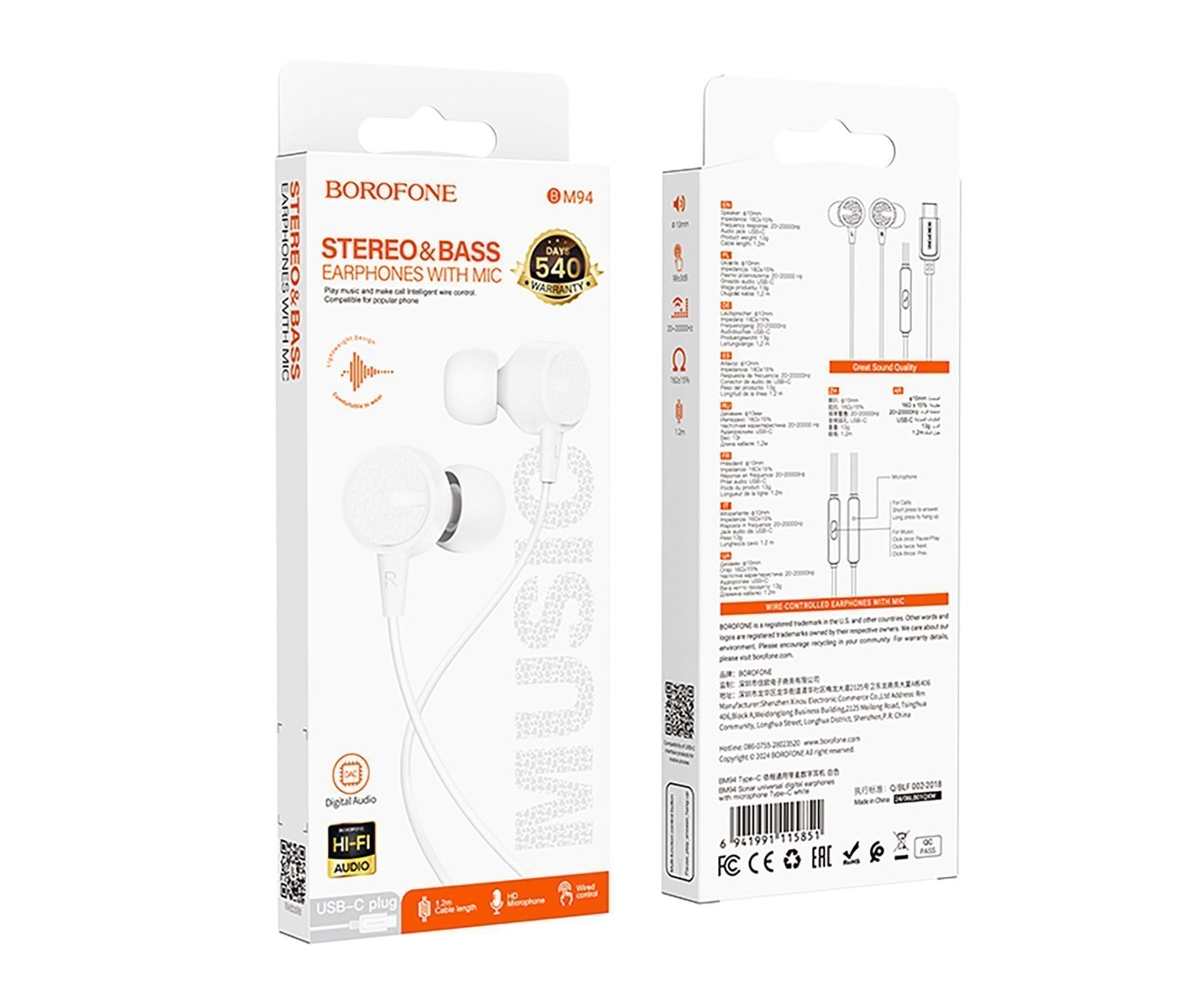 Проводные наушники внутриканальные Borofone BM94 Sonar Type-C (white) (241888)