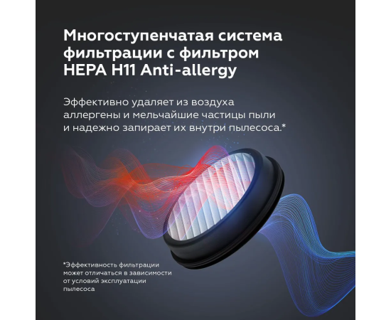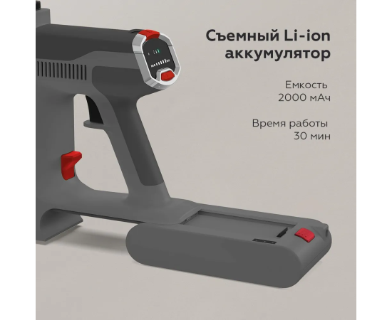 С этим пылесосом вы получите до 30 минут автономной работы на одном заряде, что позволит вам убрать всю квартиру без лишних забот о розетках. Благодаря циклонной фильтрации и высококачественному HEPA H11 Anti-allergy фильтру, воздух в вашем доме останется чистым. Фильтр задерживает даже самые мельчайшие частицы пыли и аллергенов. Вы также можете выбирать между двумя уровнями мощности, чтобы оптимизировать уборку в зависимости от типа поверхности и степени загрязнения.Съемный Li-ion емкостью 2000 мАч аккумулятор облегчает процесс подзарядки и замены, что обеспечит вам максимальную гибкость. В дополнение к этому, у пылесоса есть турбощетка с LED-подсветкой, позволяющей обнаруживать даже самые мелкие загрязнения. Низкий уровень шума делает его использование комфортным, независимо от времени суток.