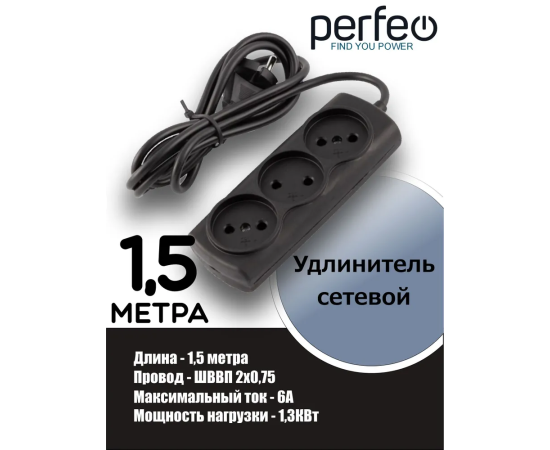Сетевой удлинитель Радист / 1,5м, 3 розетки, 6А, 2*0,75мм ШВВП, без заземления , (Р16-010), черный