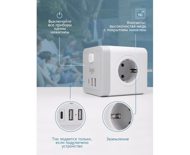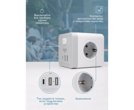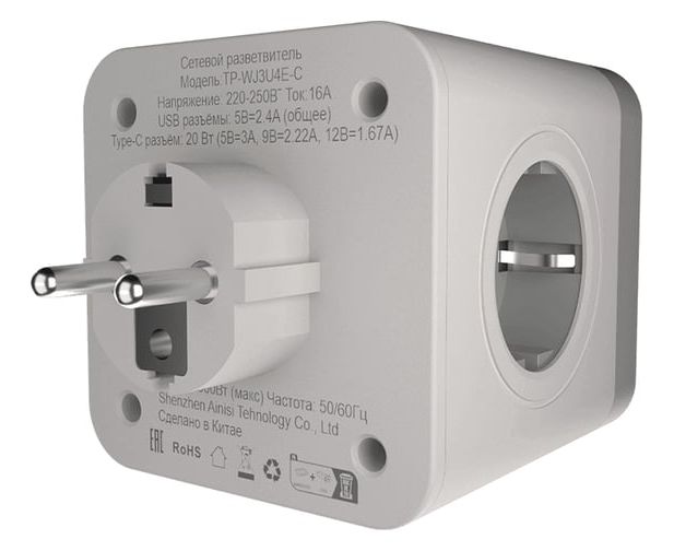 Разветвитель AGNI TP-WJ3U4E-C-white 4 розетки, 16А, 4000Вт, 220-250В, 2*USB, Type-C, белый