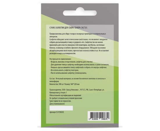 Салфетки Cactus CS-P2003E для сбора тонера 100шт сухих