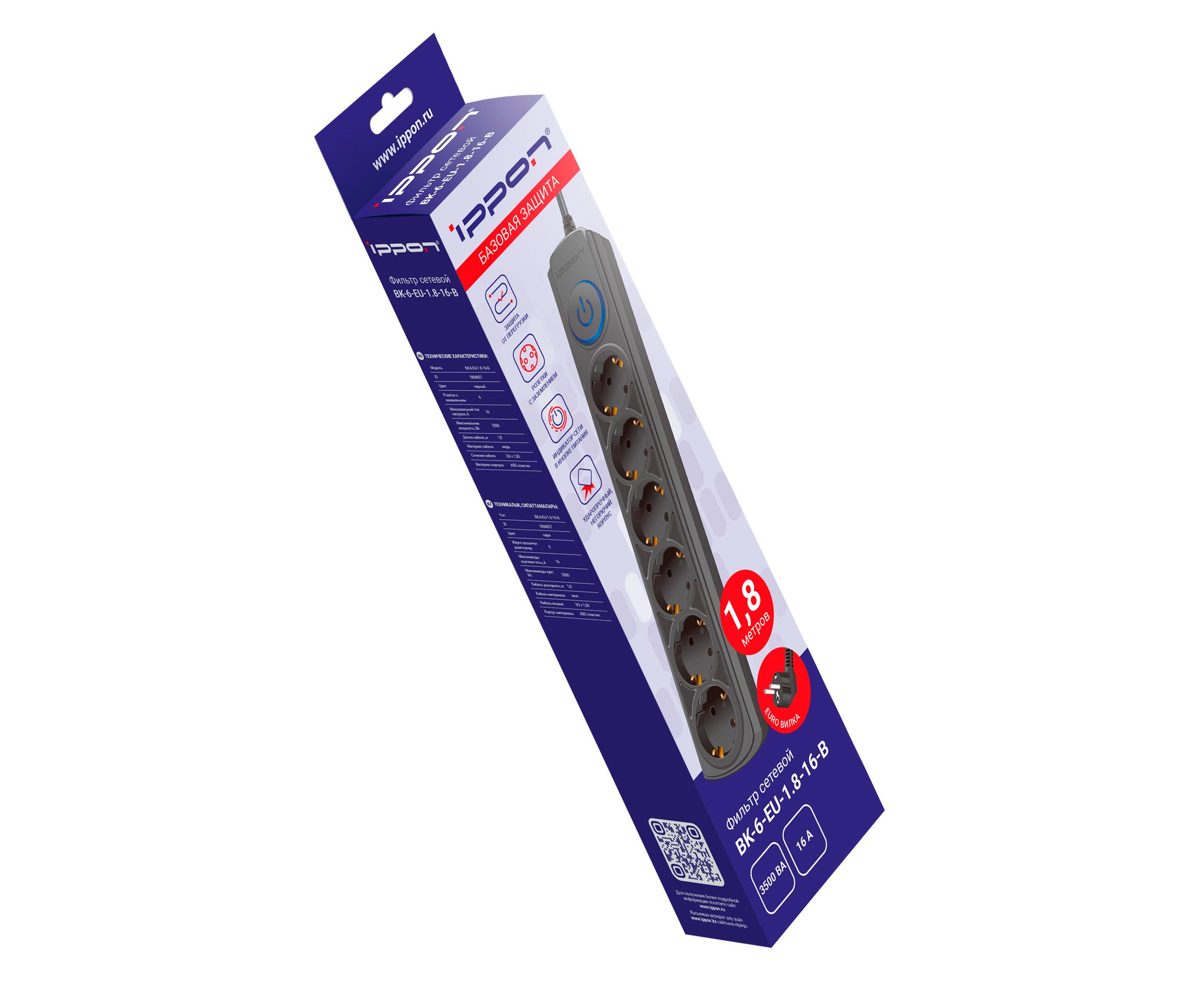 Сетевой фильтр Ippon BK-6-EU-1.8-16-B (1.8м 6 розеток черный)