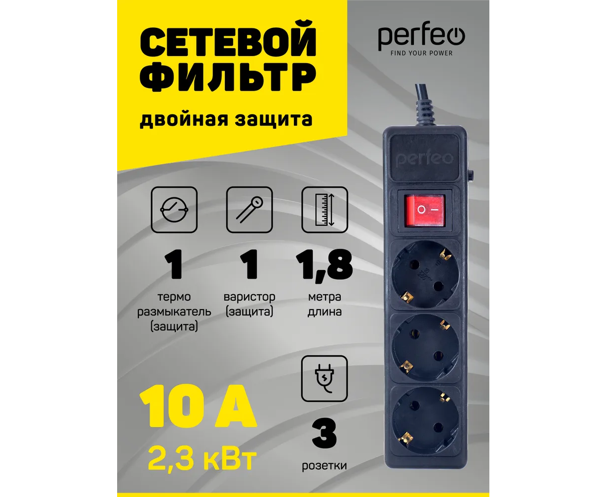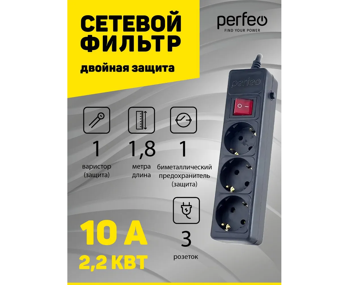 Сетевой фильтр Perfeo "POWER+", 1,8м, 3 розетки, (PF-PP-3/1,8-B), черный