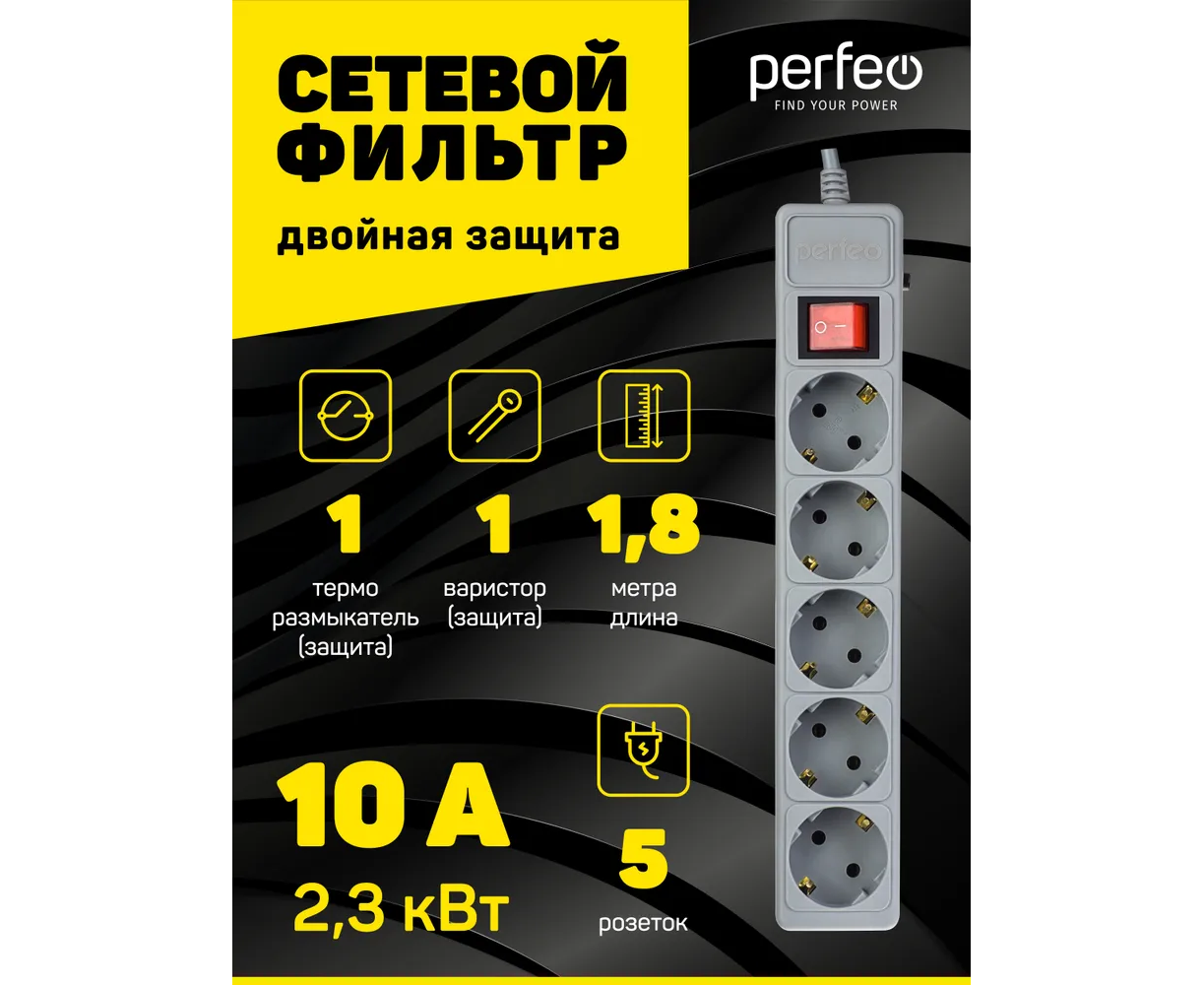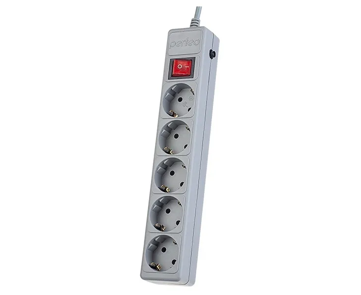 Сетевой фильтр Perfeo "POWER+", 1,8м, 5 розеток, (PF-PP-5/1,8-G), серый